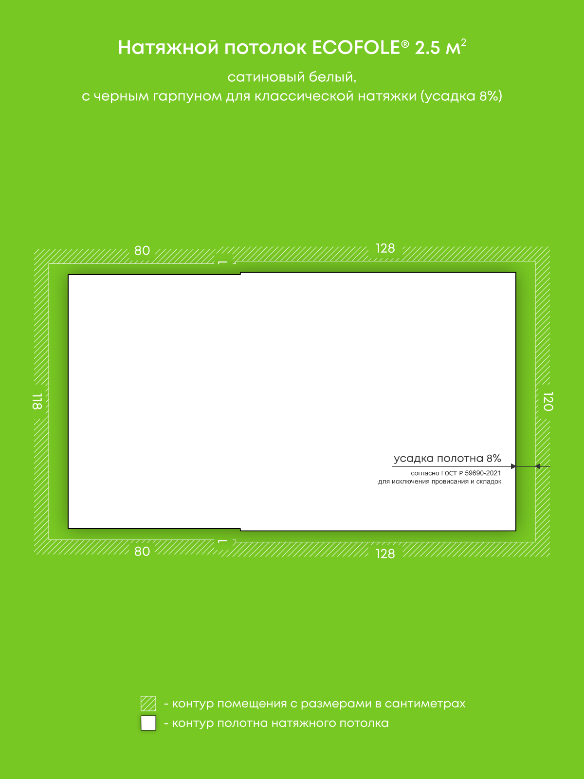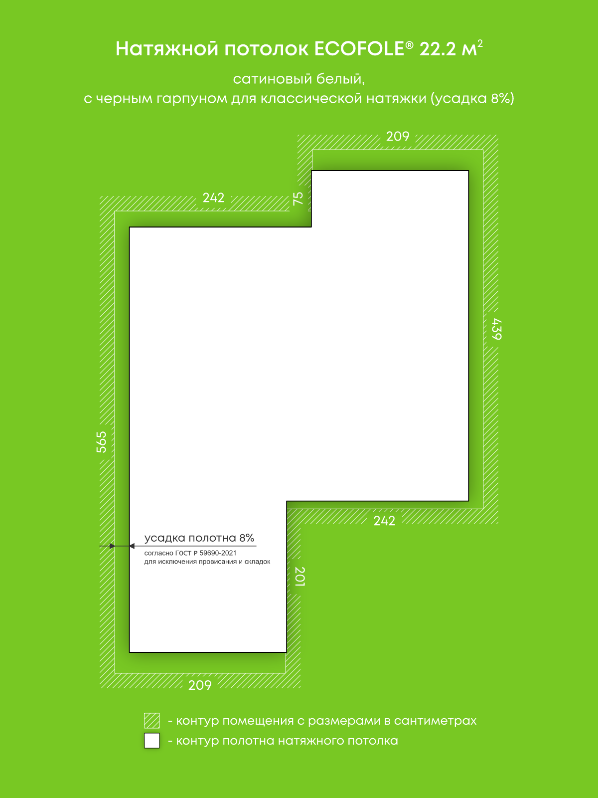 Натяжные потолки, изготовленные по индивидуальным размерам покупателя, для двух помещений площадью 22.2 м2, 2.5 м2