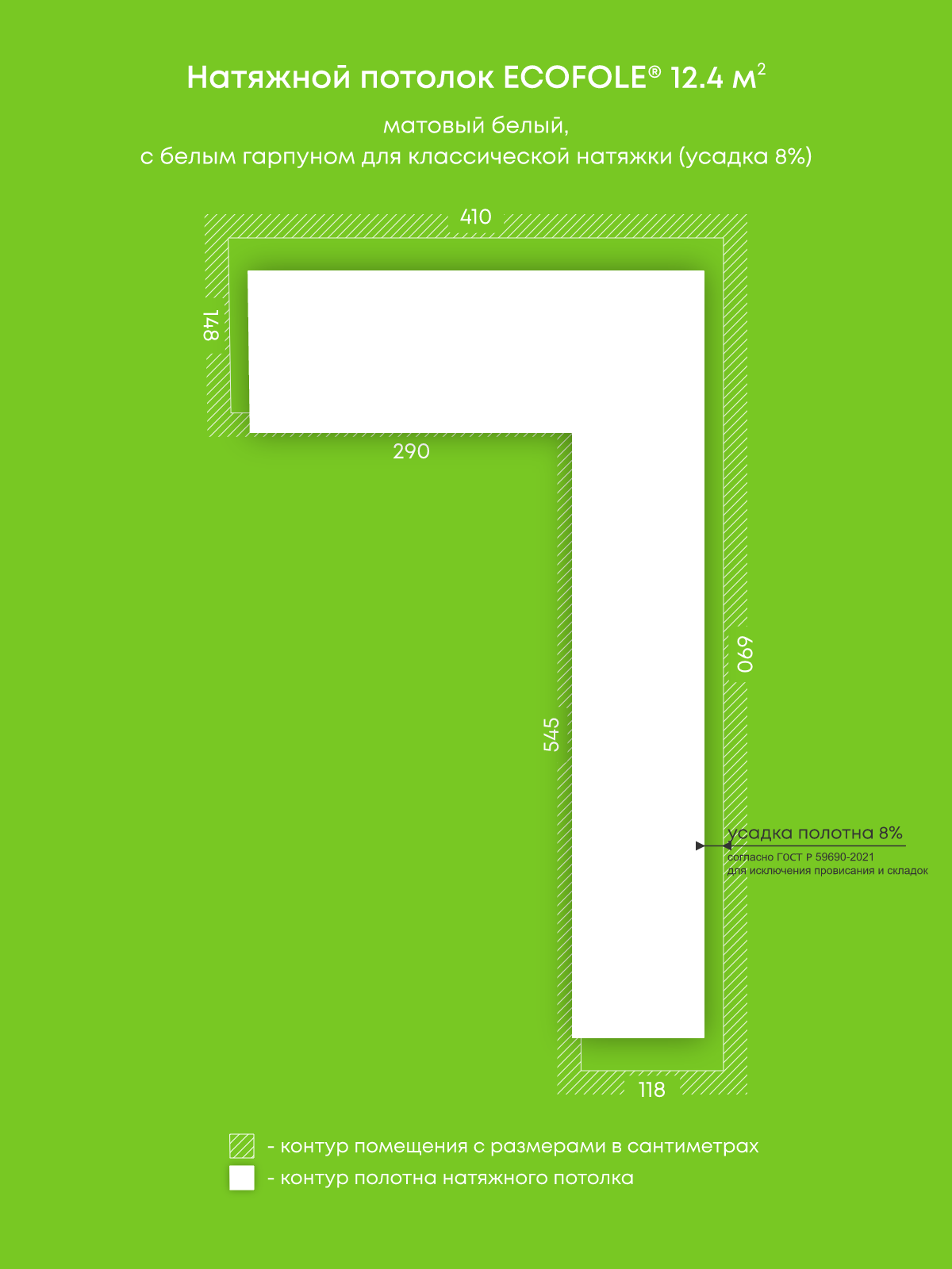 Натяжные потолки, изготовленные по индивидуальным размерам покупателя, для пяти помещений площадью 23.5 м2, 7.8 м2, 6.2 м2, 9.2 м2, 12.4 м2