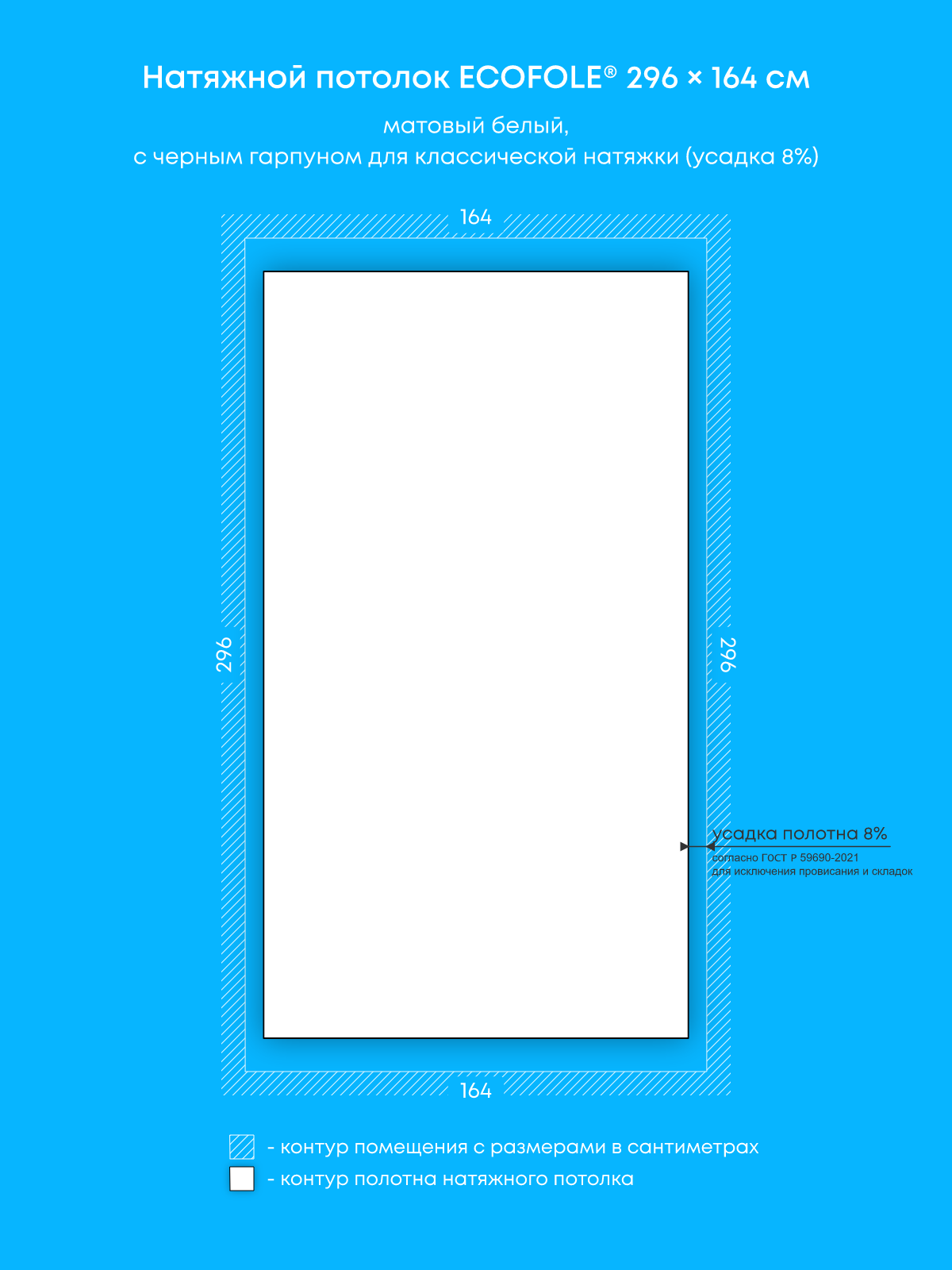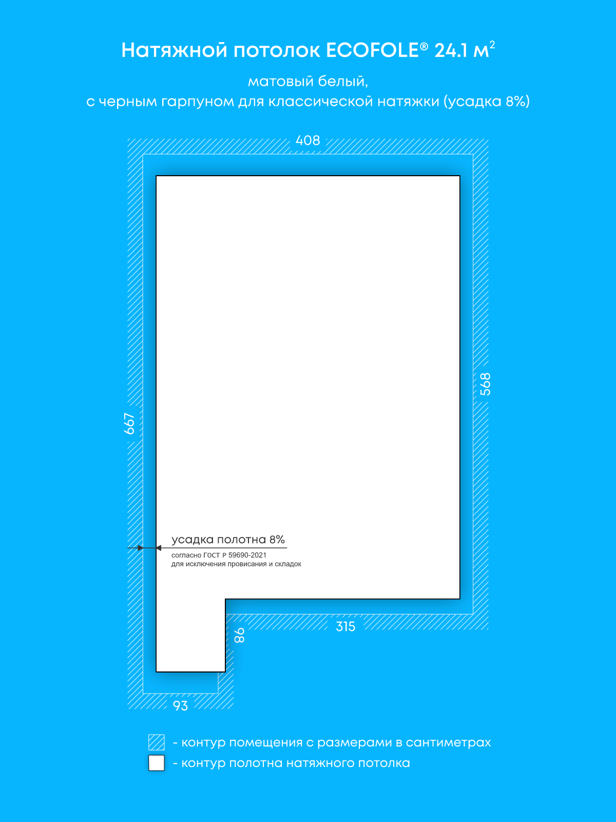 Натяжные потолки, изготовленные по индивидуальным размерам покупателя, для двух помещений площадью 24.1 м2, 4.9 м2
