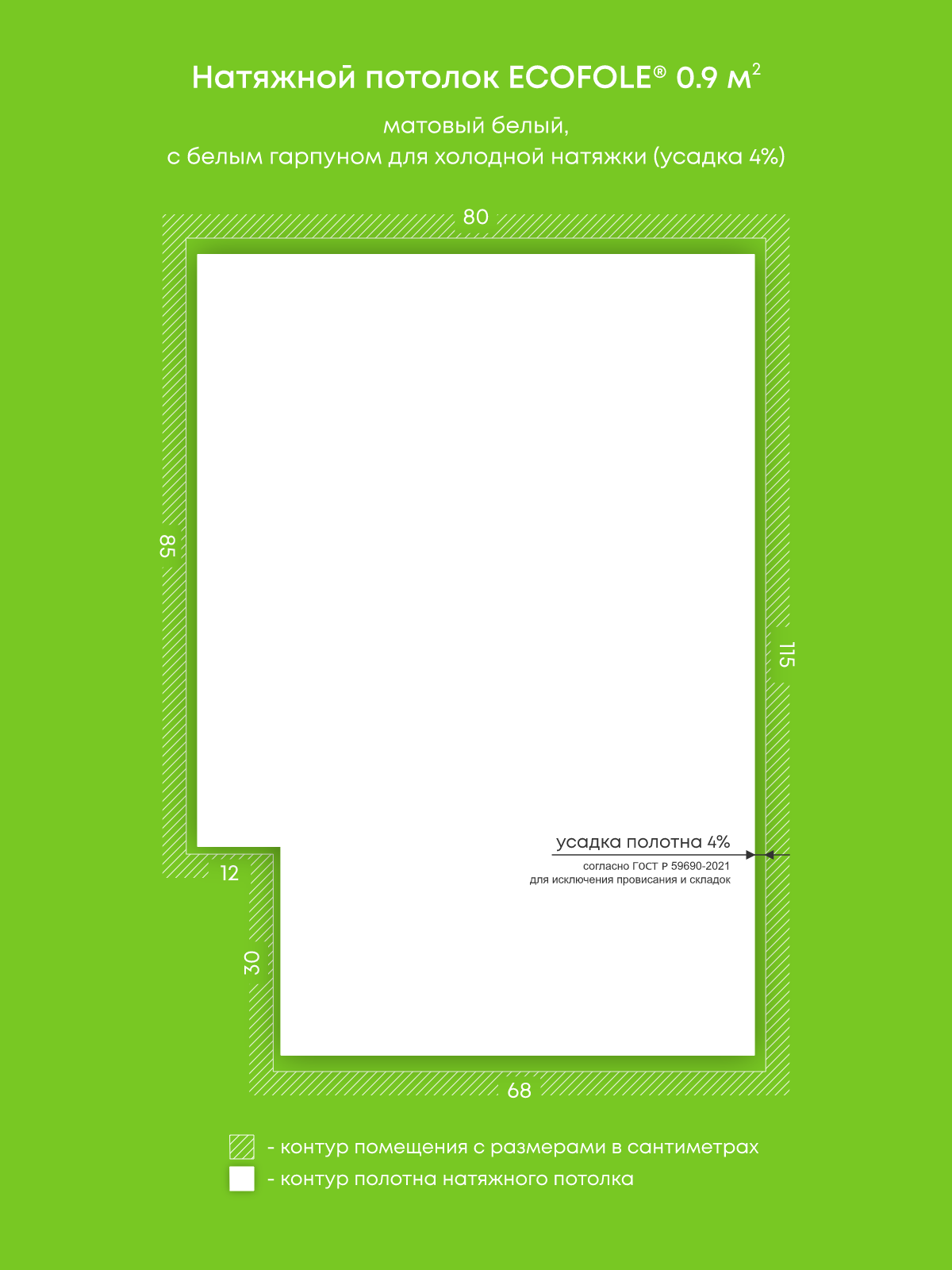 Натяжные потолки, изготовленные по индивидуальным размерам покупателя, для двух помещений площадью 2.5 м2, 0.9 м2