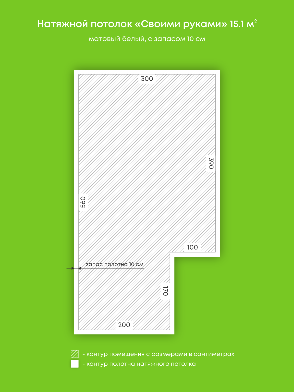Натяжные потолки, изготовленные по индивидуальным размерам покупателя, для четырех помещений площадью 2.5 м2, 1.1 м2, 15.1 м2, 4.9 м2