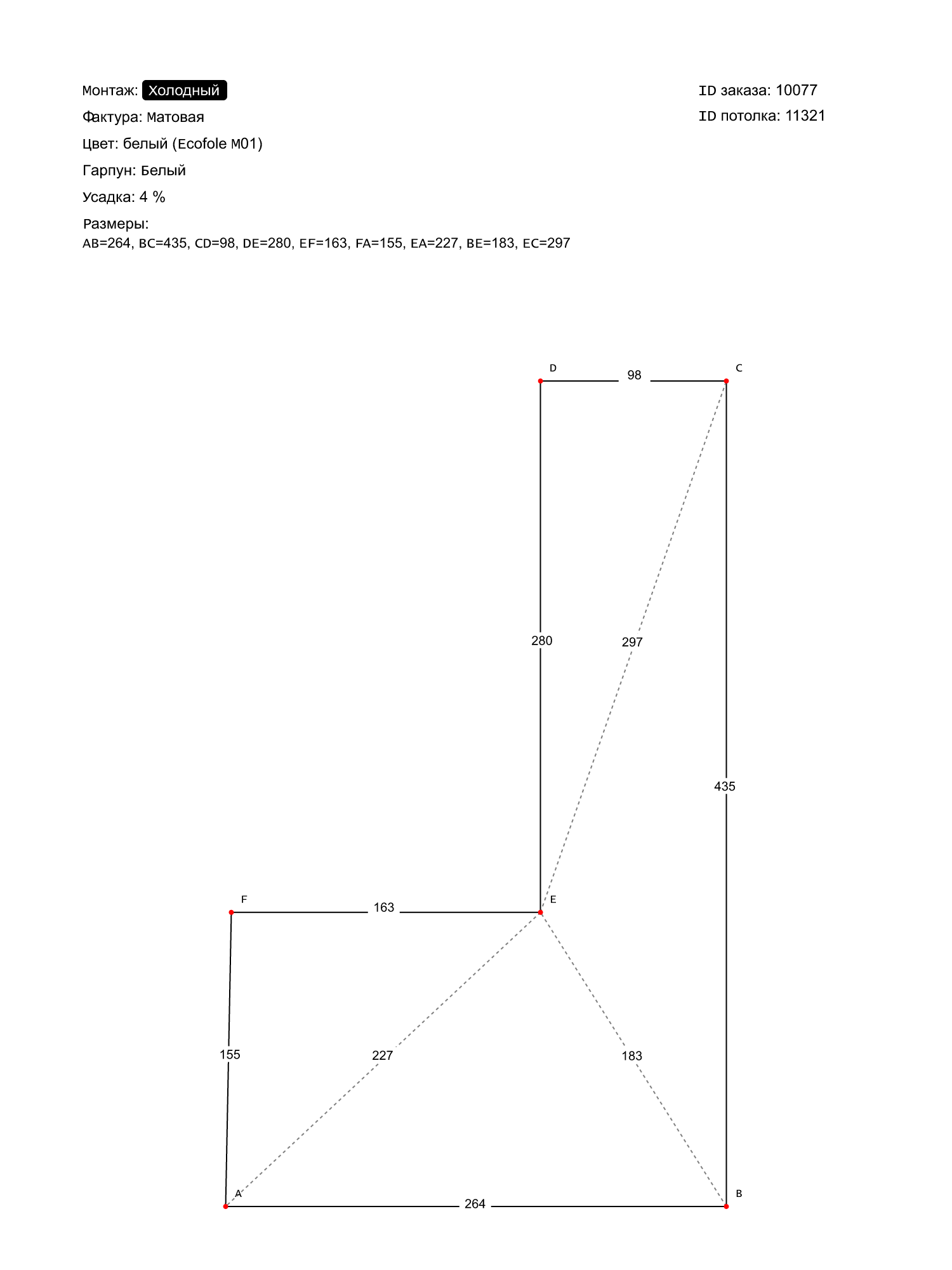 Натяжные потолки изготовленные по индивидуальным размерам покупателя, для пяти помещений площадью: 2.6 м2, 1.2 м2, 10.3 м2, 16.4 м2, 6.8 м2