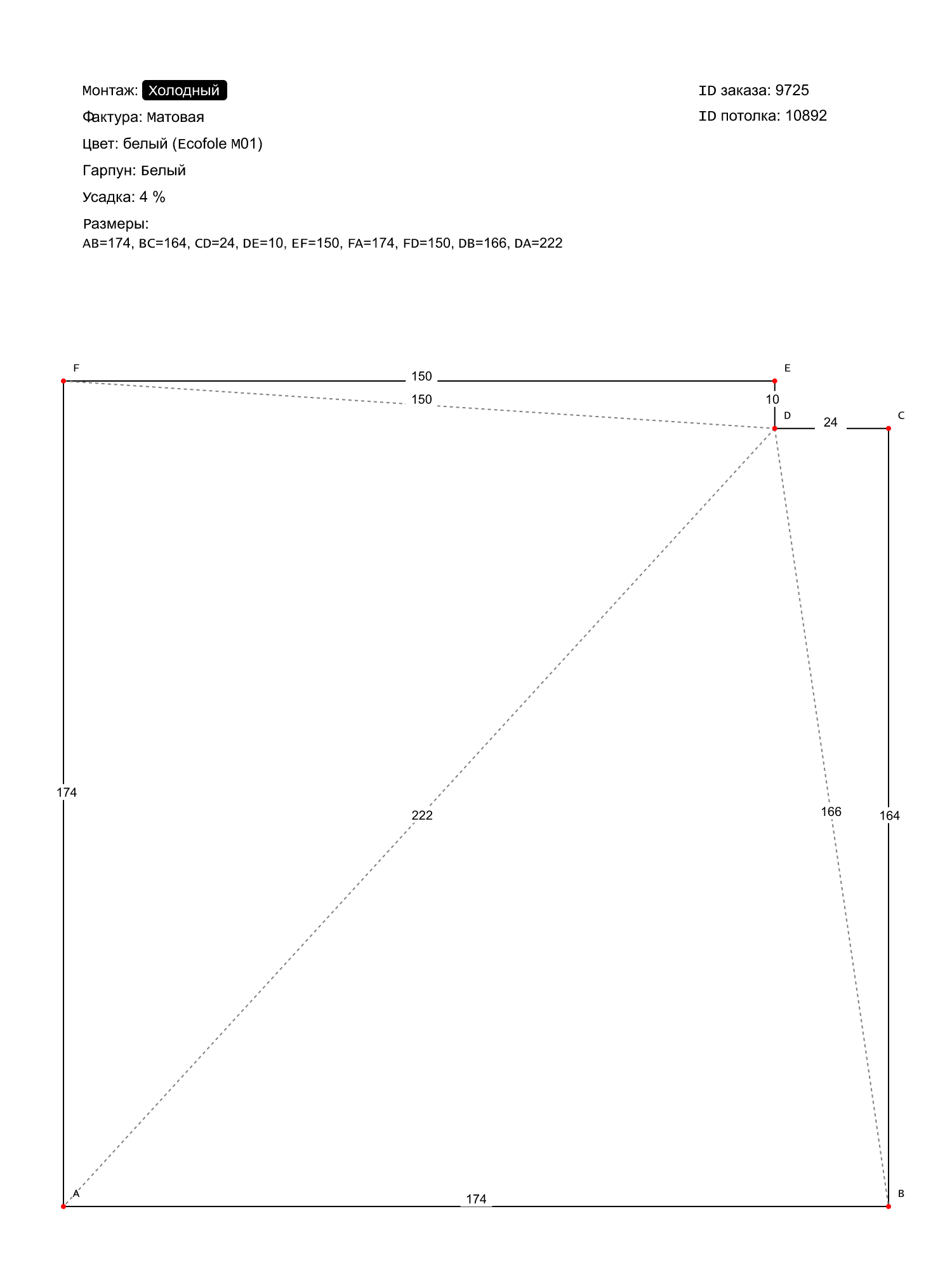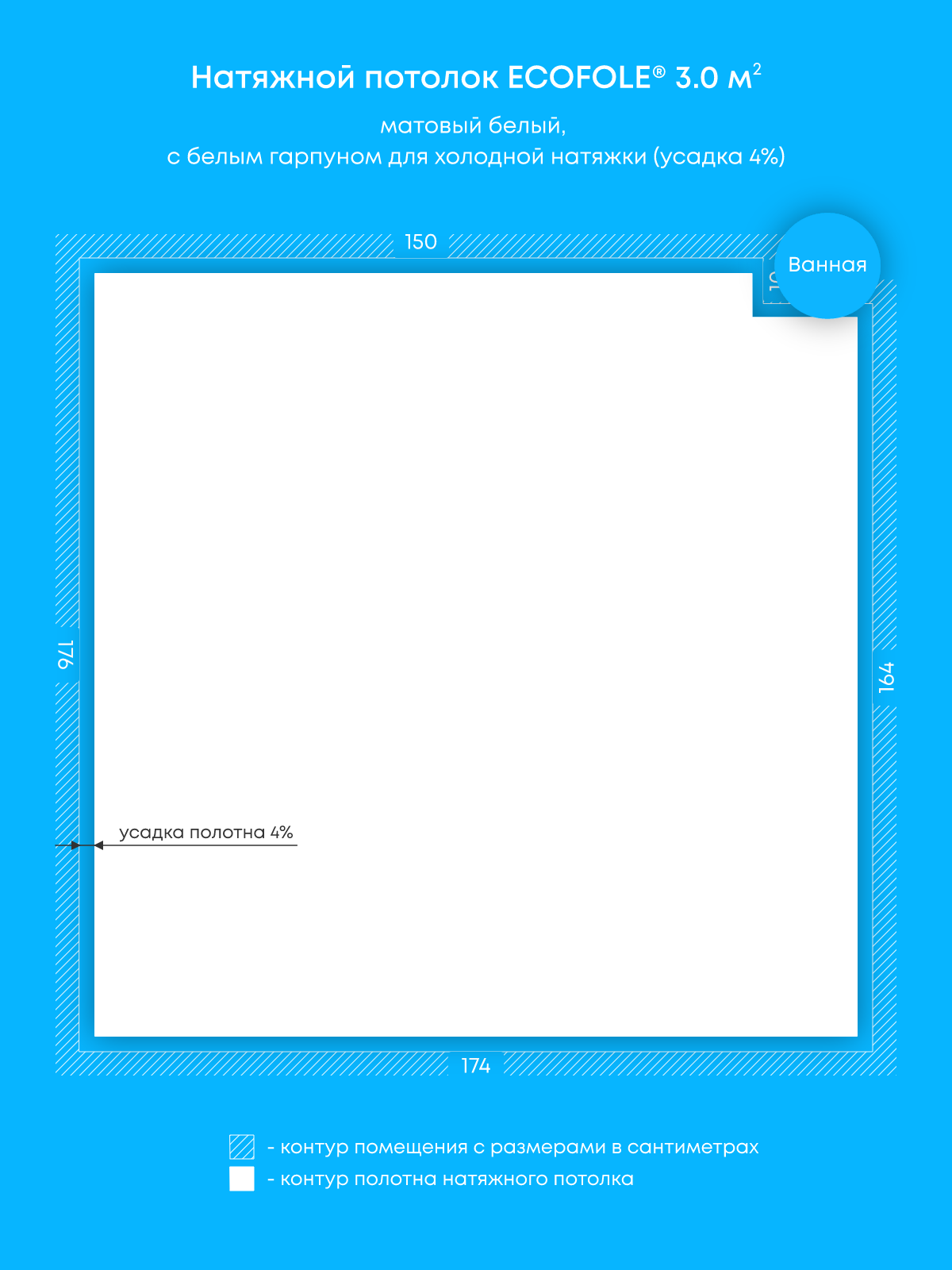 Натяжные потолки изготовленные по индивидуальным размерам покупателя, для двух помещений площадью: 3 м2, 1.1 м2