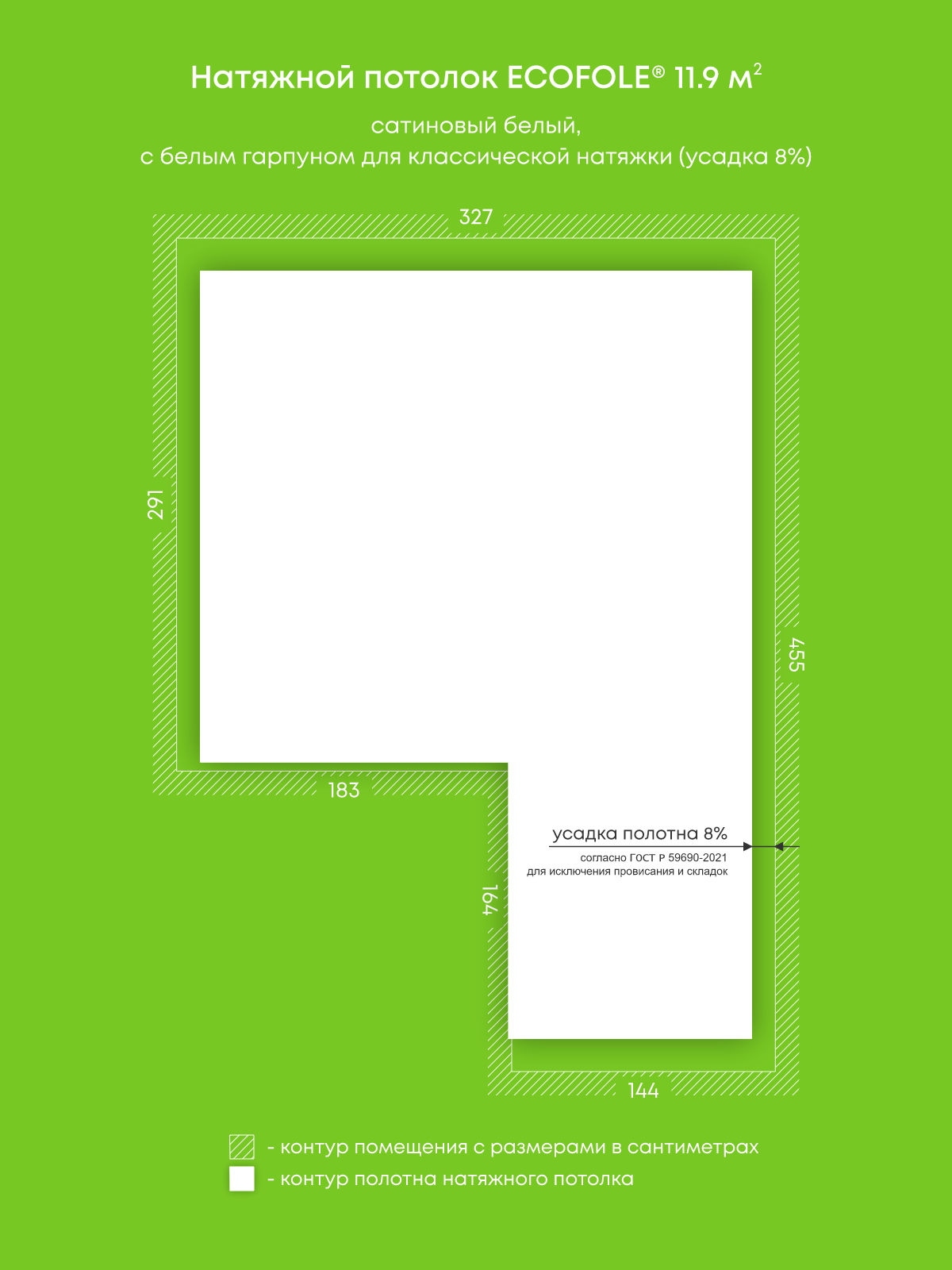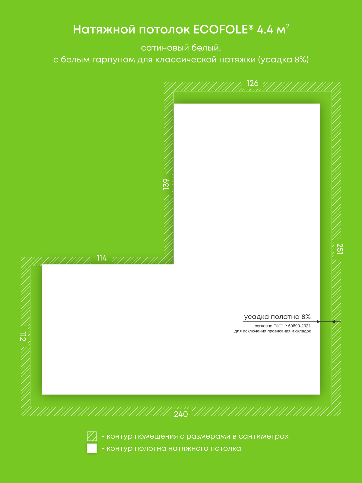 Натяжные потолки, изготовленные по индивидуальным размерам покупателя, для четырех помещений площадью 30.6 м2, 0.9 м2, 11.9 м2, 4.4 м2