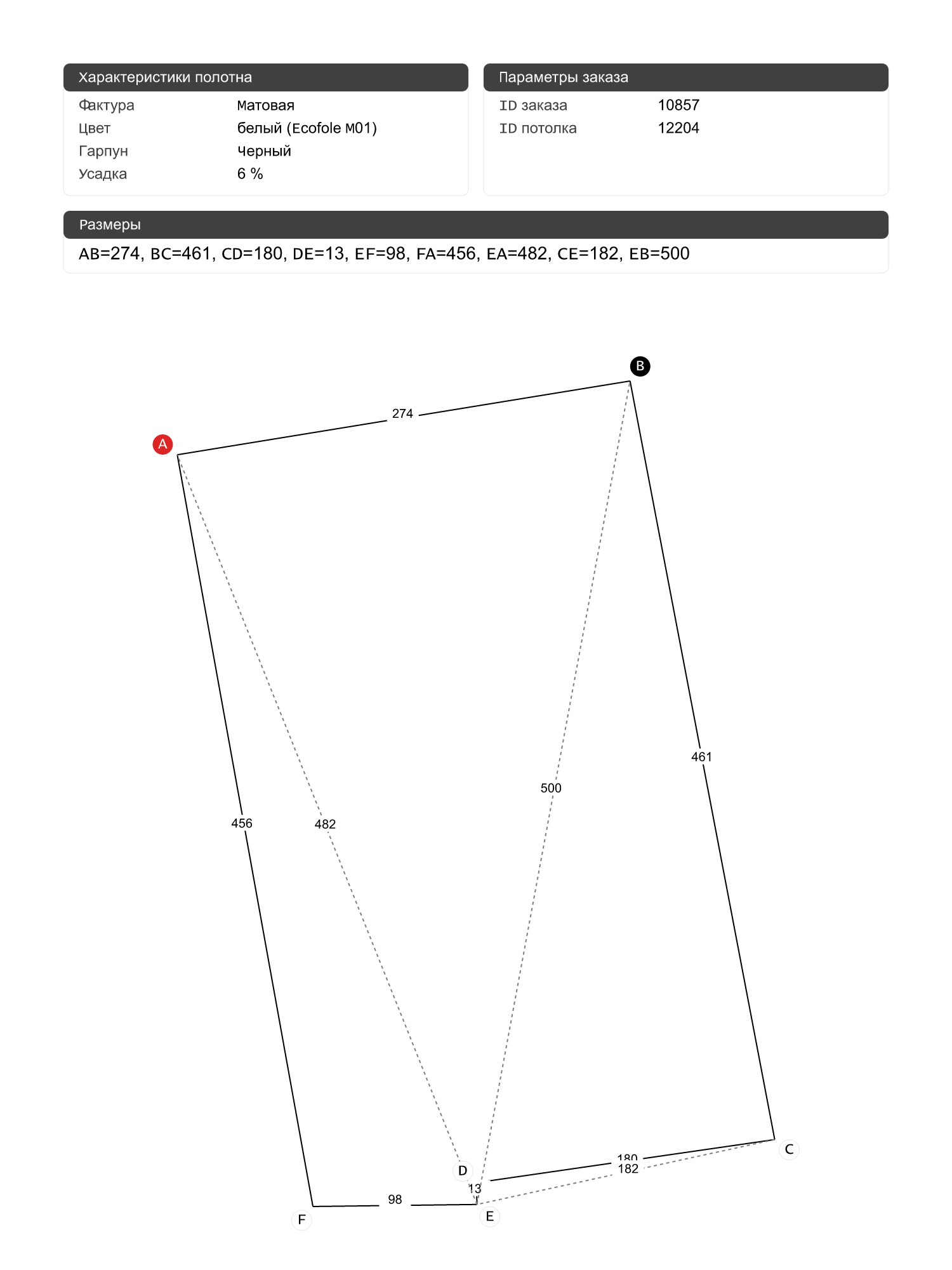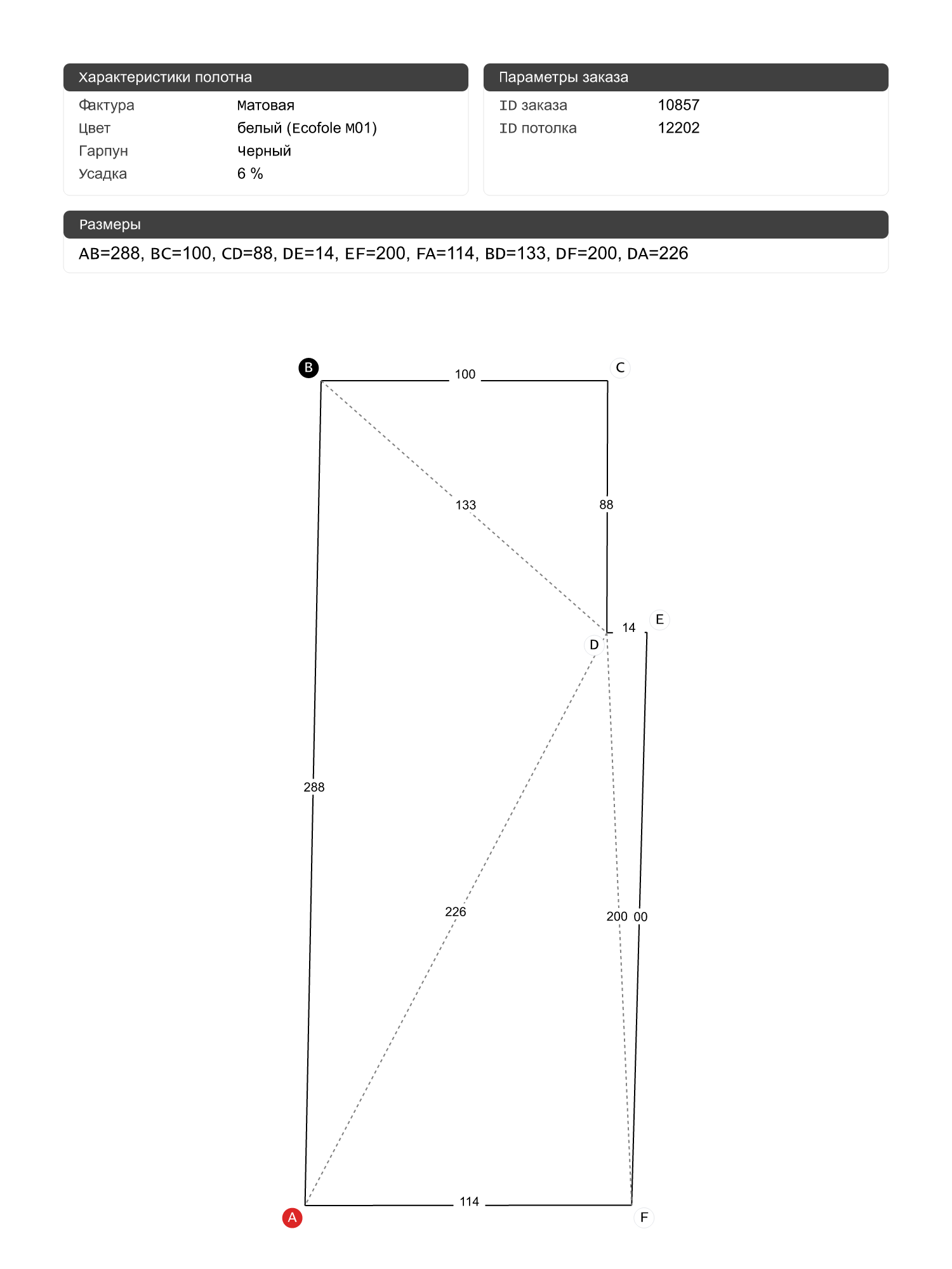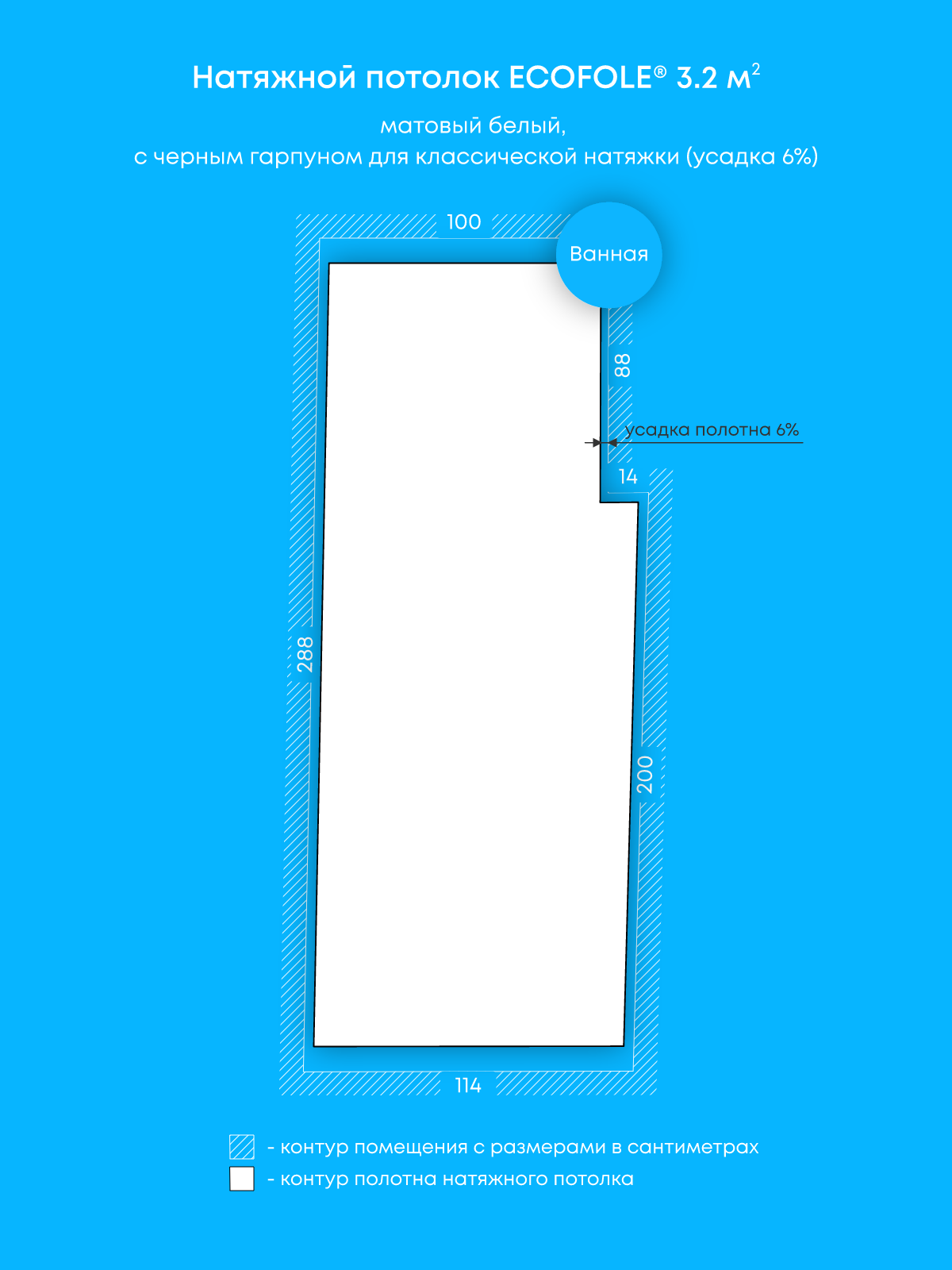 Натяжные потолки изготовленные по индивидуальным размерам покупателя, для двух помещений площадью: 3.2 м2, 12.7 м2