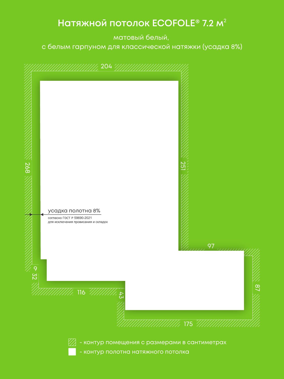 Натяжные потолки, изготовленные по индивидуальным размерам покупателя, для четырех помещений площадью 3.2 м2, 5.7 м2, 8.4 м2, 7.2 м2