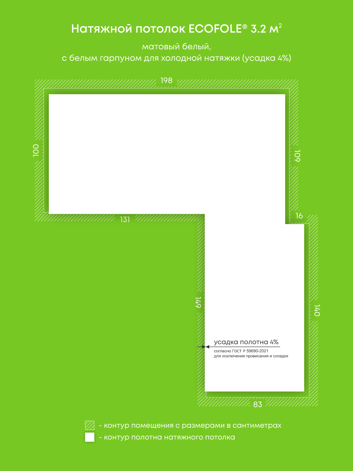 Натяжные потолки, изготовленные по индивидуальным размерам покупателя, для четырех помещений площадью 3.2 м2, 7.8 м2, 9.6 м2, 2 м2
