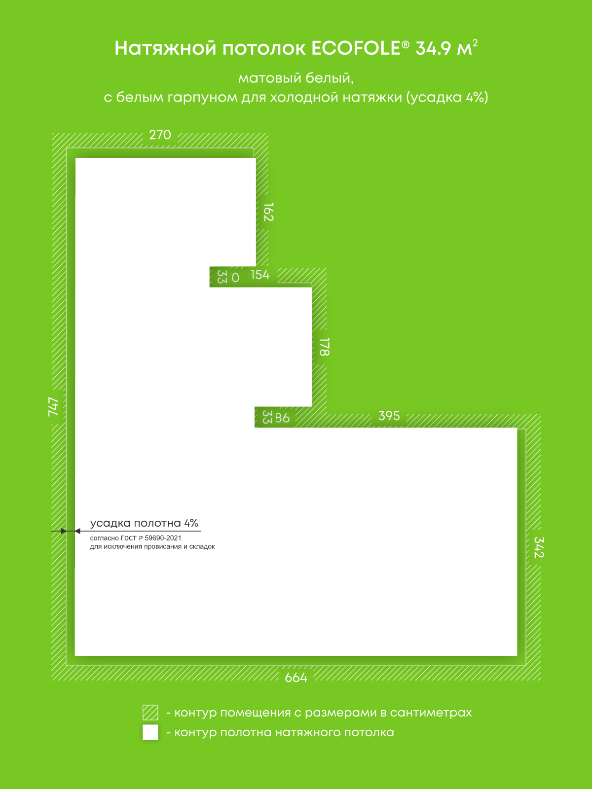 Натяжные потолки, изготовленные по индивидуальным размерам покупателя, для четырех помещений площадью 34.9 м2, 11.6 м2, 5.4 м2, 11.7 м2