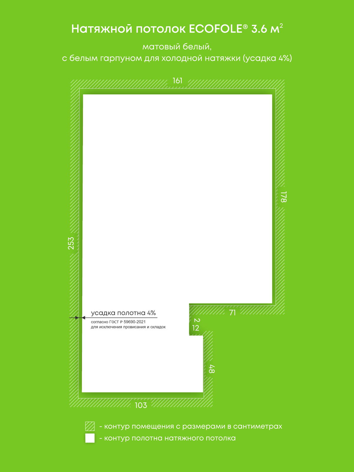 Натяжные потолки, изготовленные по индивидуальным размерам покупателя, для двух помещений площадью 3.6 м2, 1.1 м2