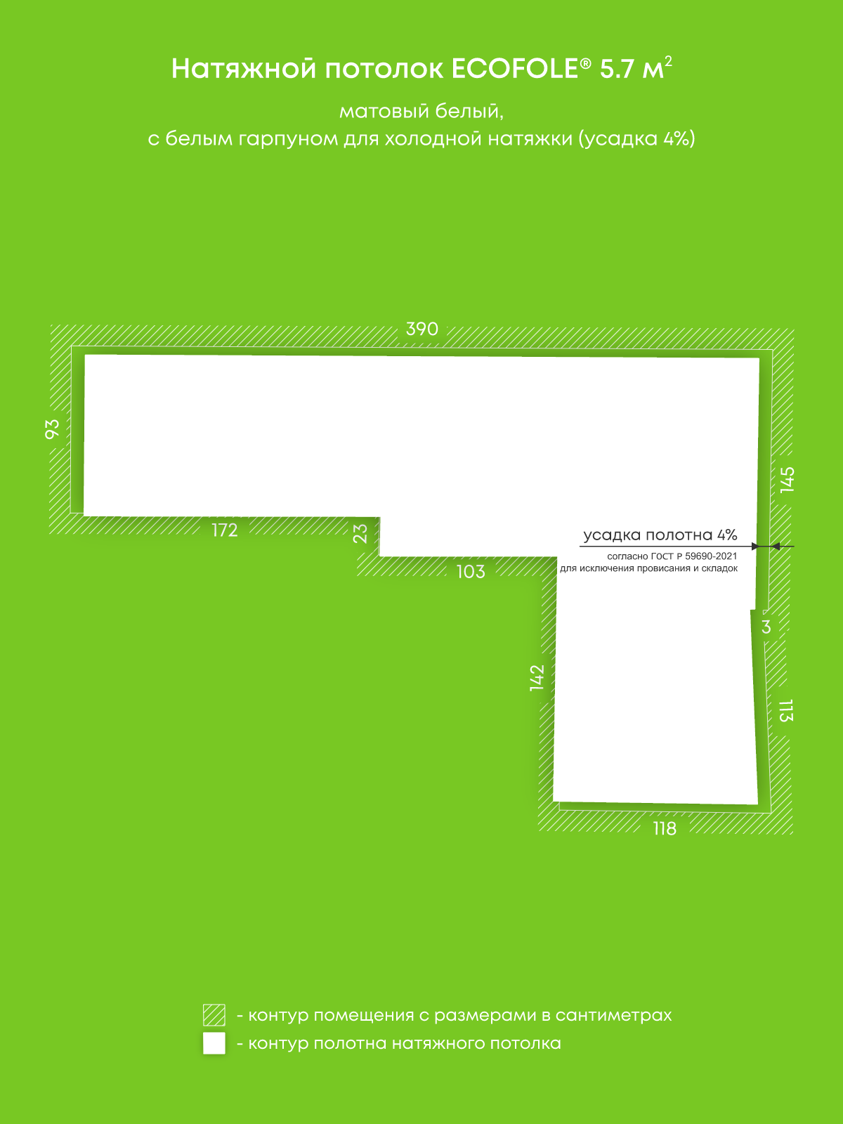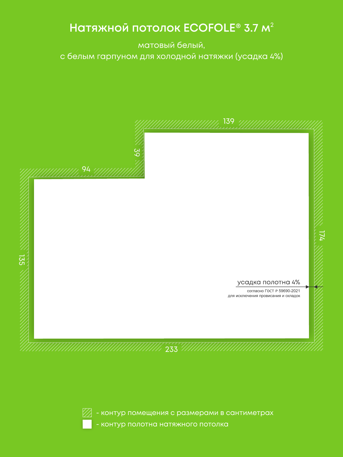 Натяжные потолки, изготовленные по индивидуальным размерам покупателя, для трех помещений площадью 3.7 м2, 5.7 м2, 14.7 м2