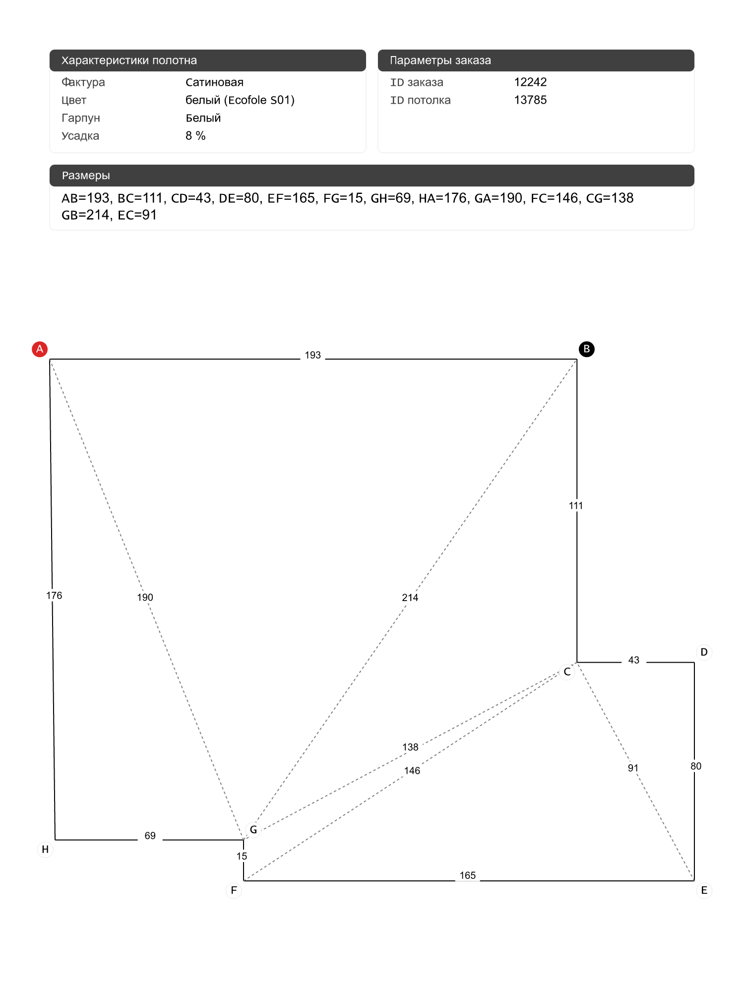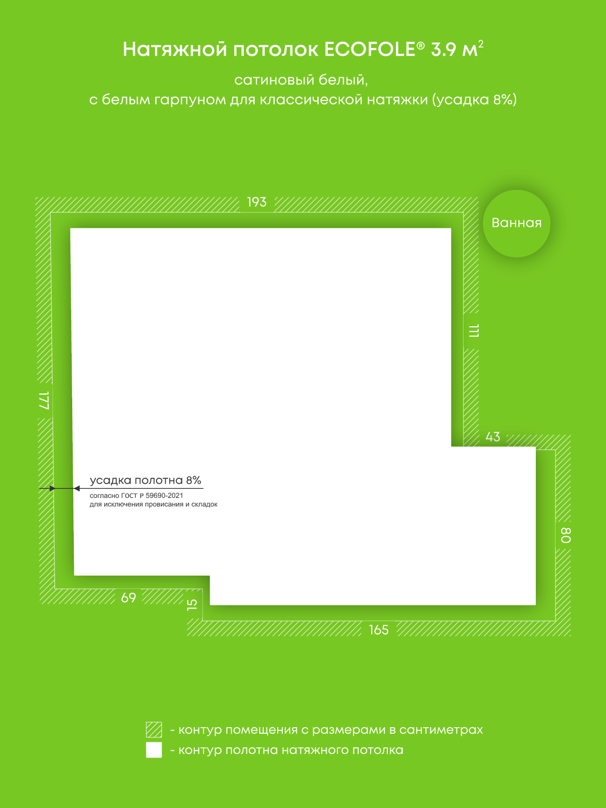 Натяжные потолки изготовленные по индивидуальным размерам покупателя, для двух помещений площадью: 3.9 м2, 1.5 м2