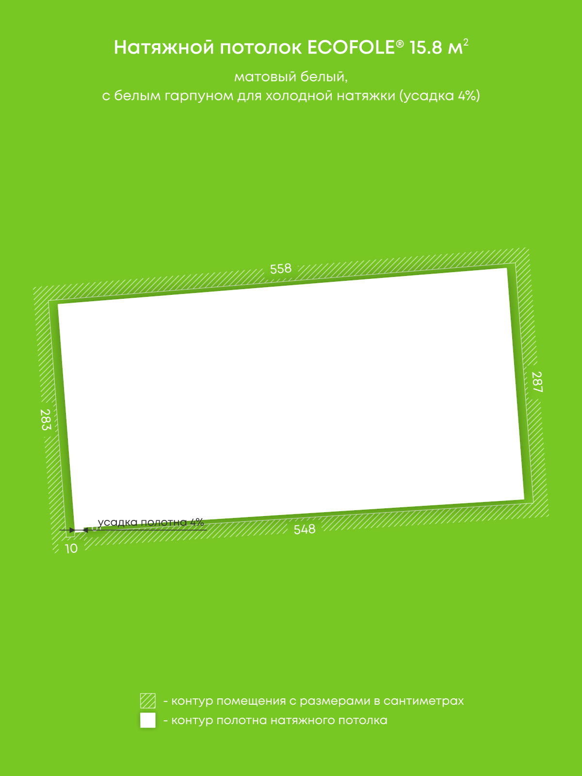Натяжные потолки, изготовленные по индивидуальным размерам покупателя, для двух помещений площадью 3.9 м2, 15.8 м2