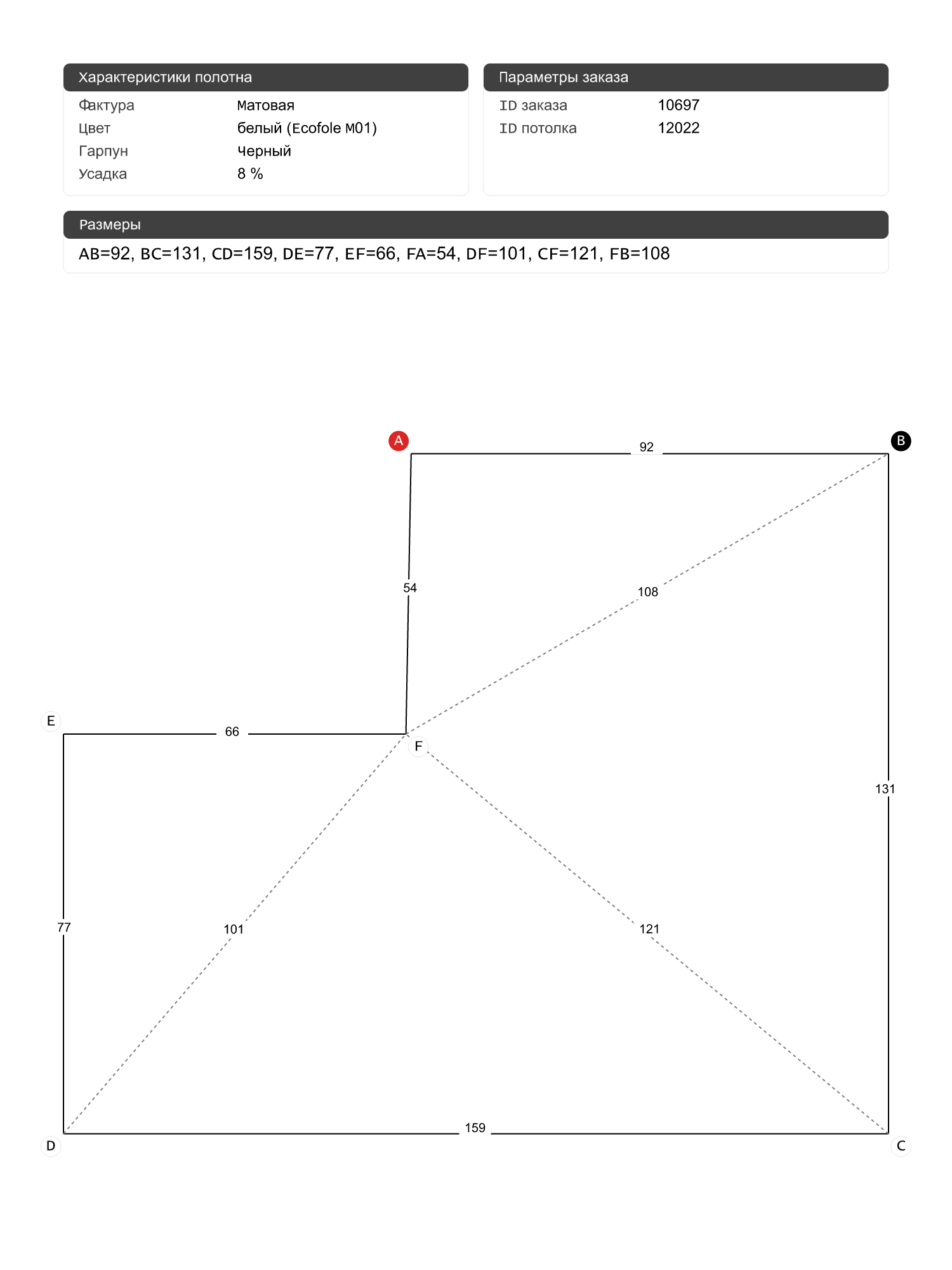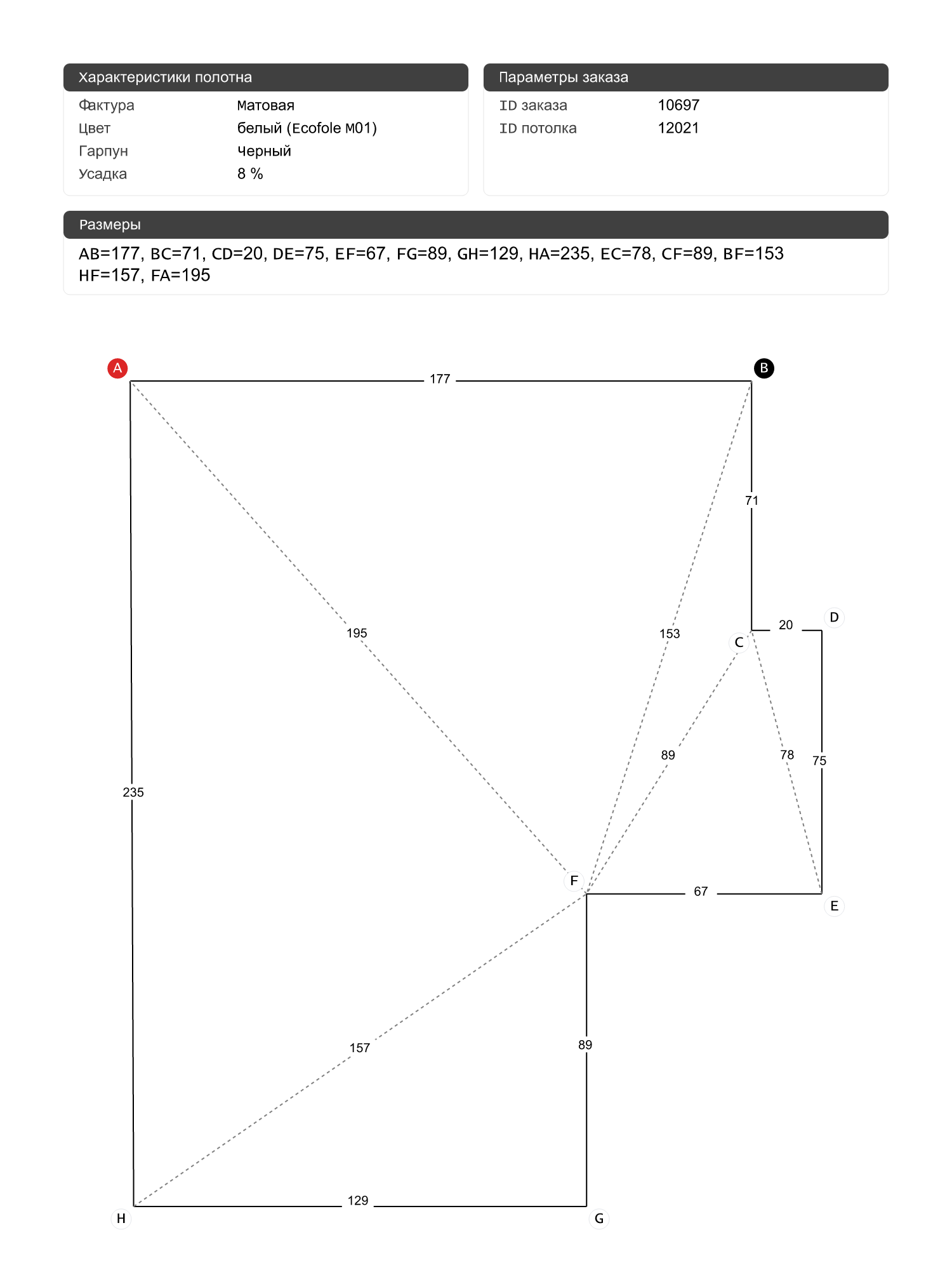 Натяжные потолки изготовленные по индивидуальным размерам покупателя, для двух помещений площадью: 3.9 м2, 1.7 м2