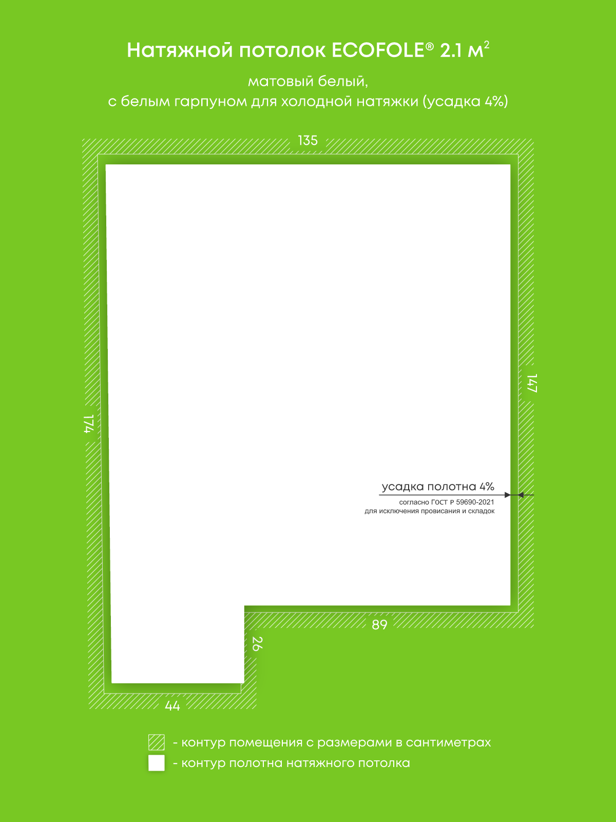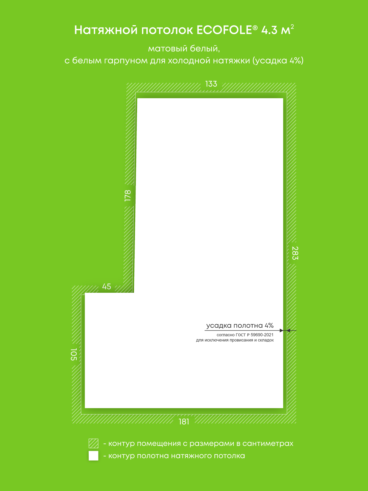 Натяжные потолки, изготовленные по индивидуальным размерам покупателя, для двух помещений площадью 4.3 м2, 2.1 м2
