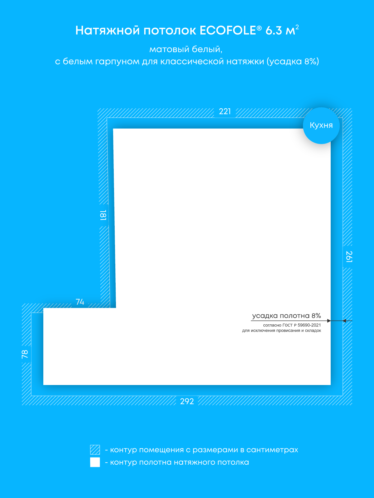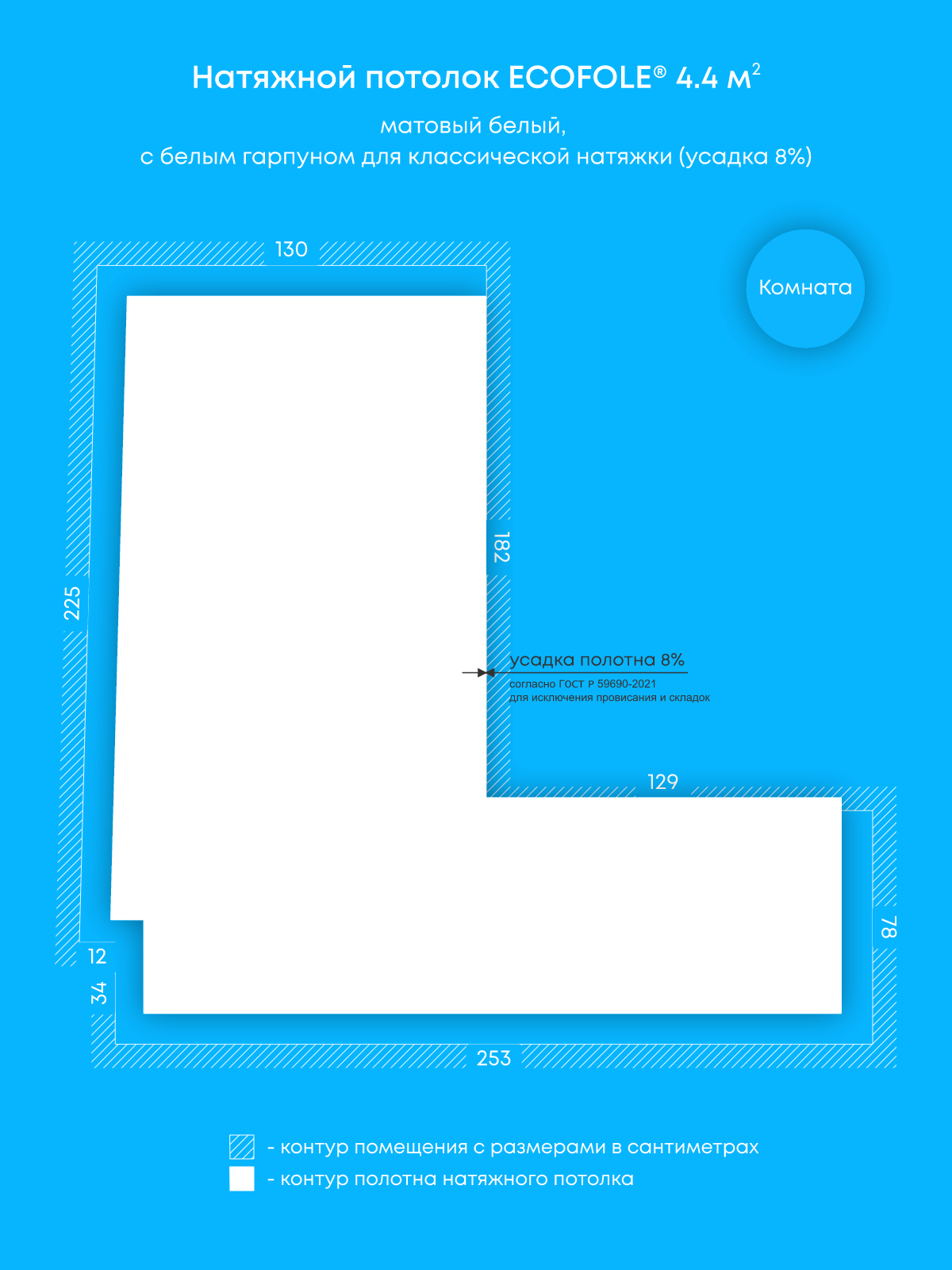 Натяжные потолки, изготовленные по индивидуальным размерам покупателя, для двух помещений площадью 4.4 м2, 6.3 м2