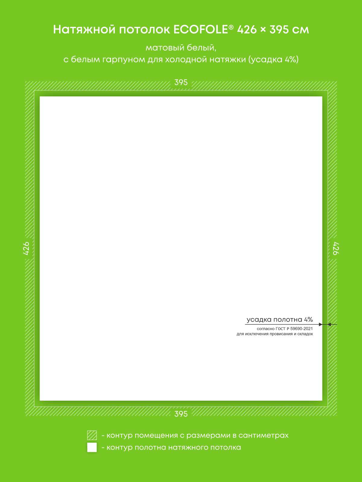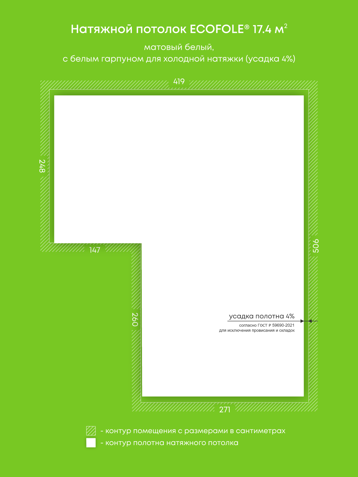Натяжные потолки, изготовленные по индивидуальным размерам покупателя, для четырех помещений площадью 4.5 м2, 17.4 м2, 5.9 м2, 16.8 м2