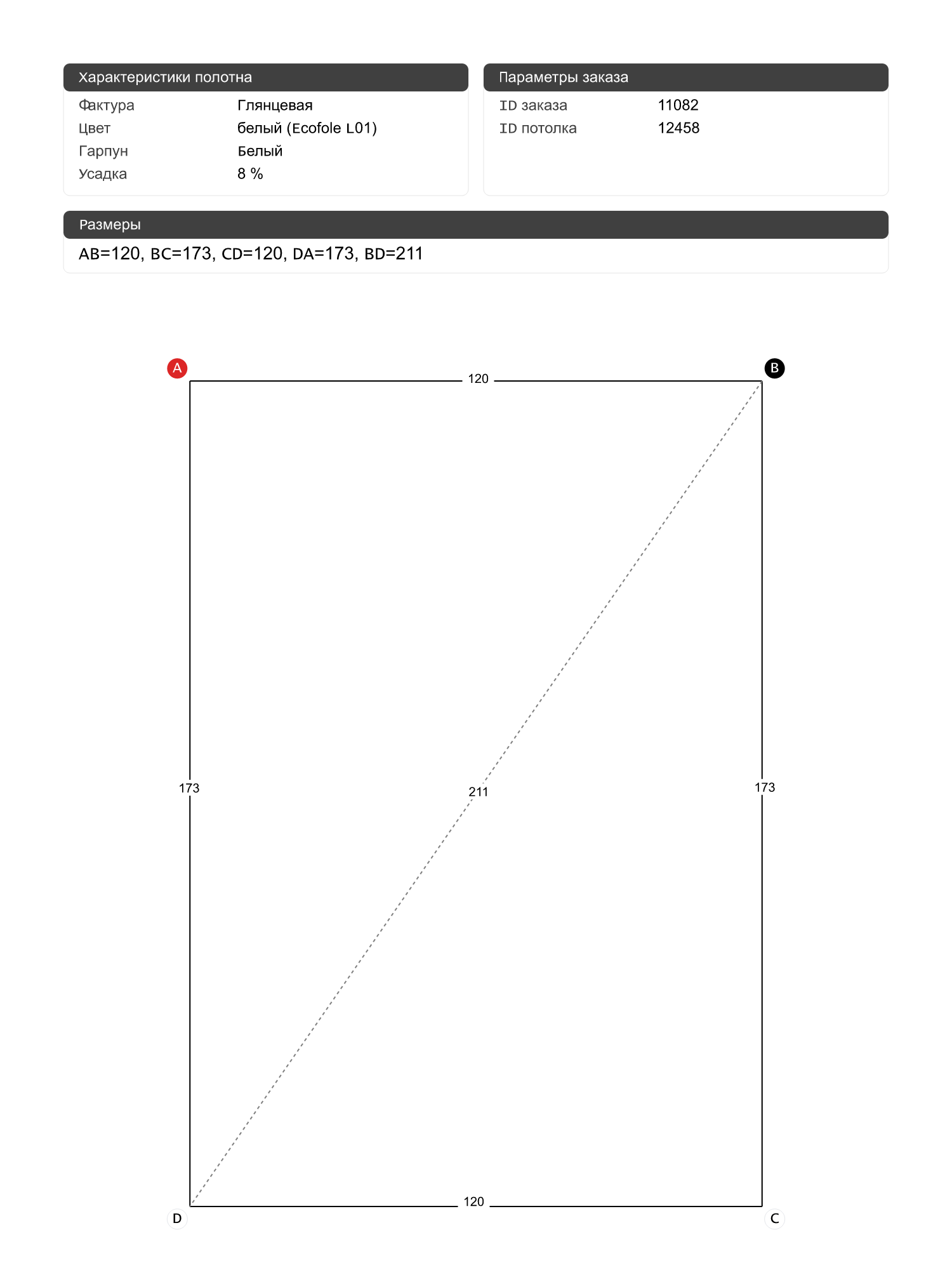 Натяжные потолки изготовленные по индивидуальным размерам покупателя, для двух помещений площадью: 4.6 м2, 2.1 м2