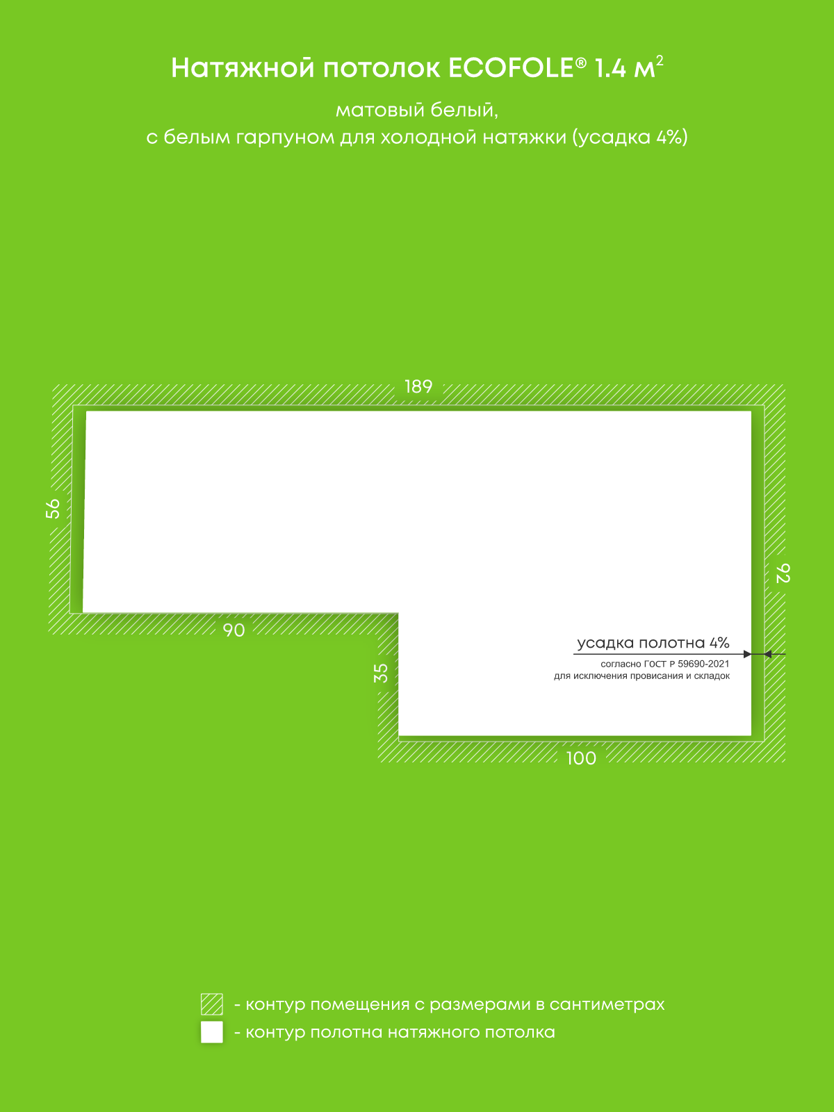 Натяжные потолки, изготовленные по индивидуальным размерам покупателя, для двух помещений площадью 5 м2, 1.4 м2