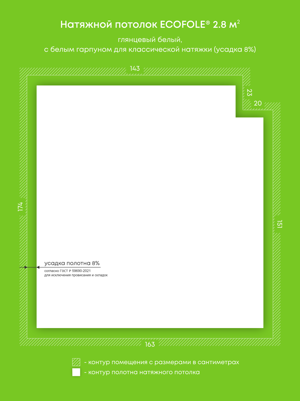 Натяжные потолки, изготовленные по индивидуальным размерам покупателя, для пяти помещений площадью 5.4 м2, 10.9 м2, 12.6 м2, 9.3 м2, 2.8 м2