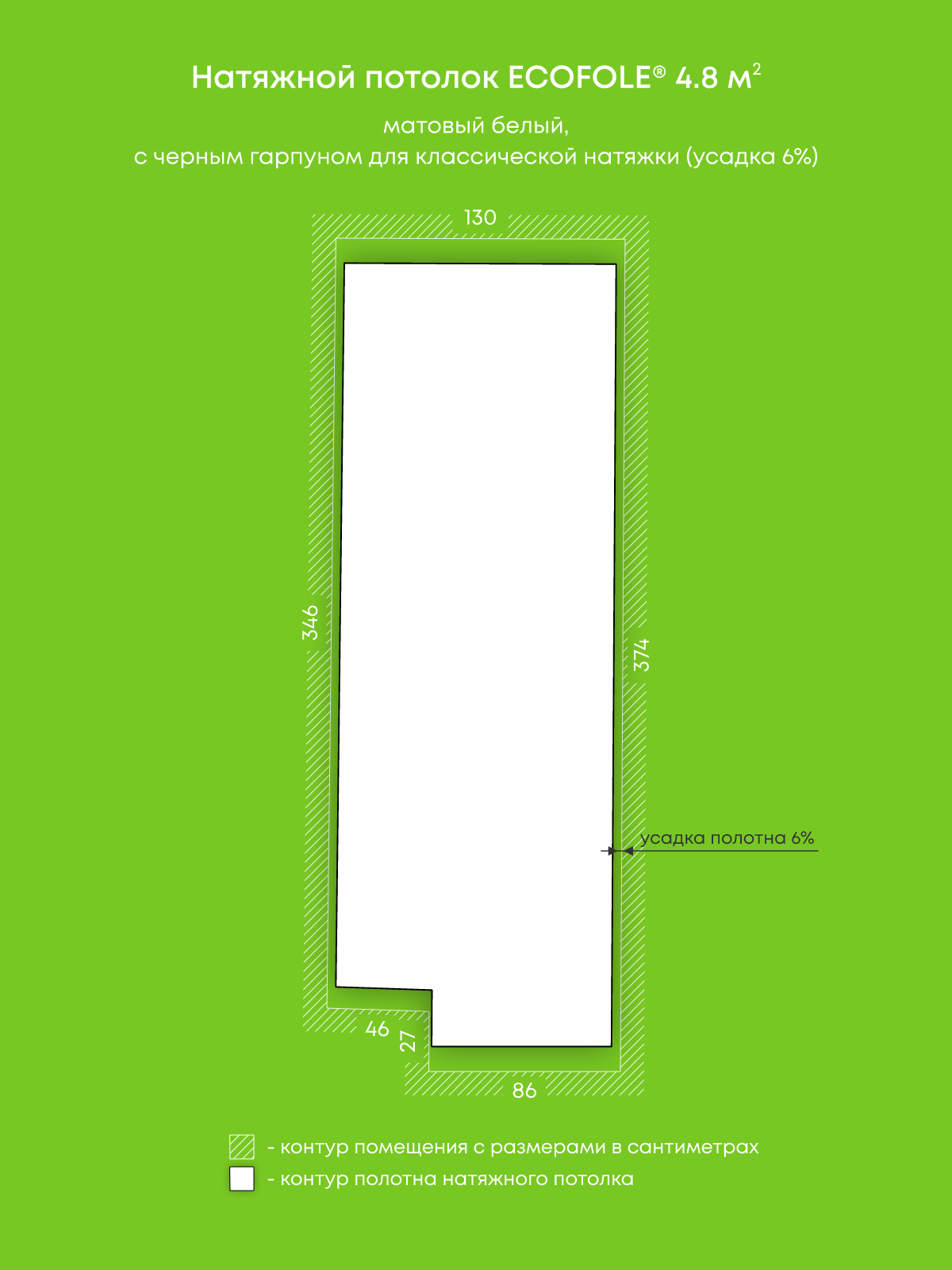 Натяжные потолки, изготовленные по индивидуальным размерам покупателя, для трех помещений площадью 5.4 м2, 6.9 м2, 4.8 м2
