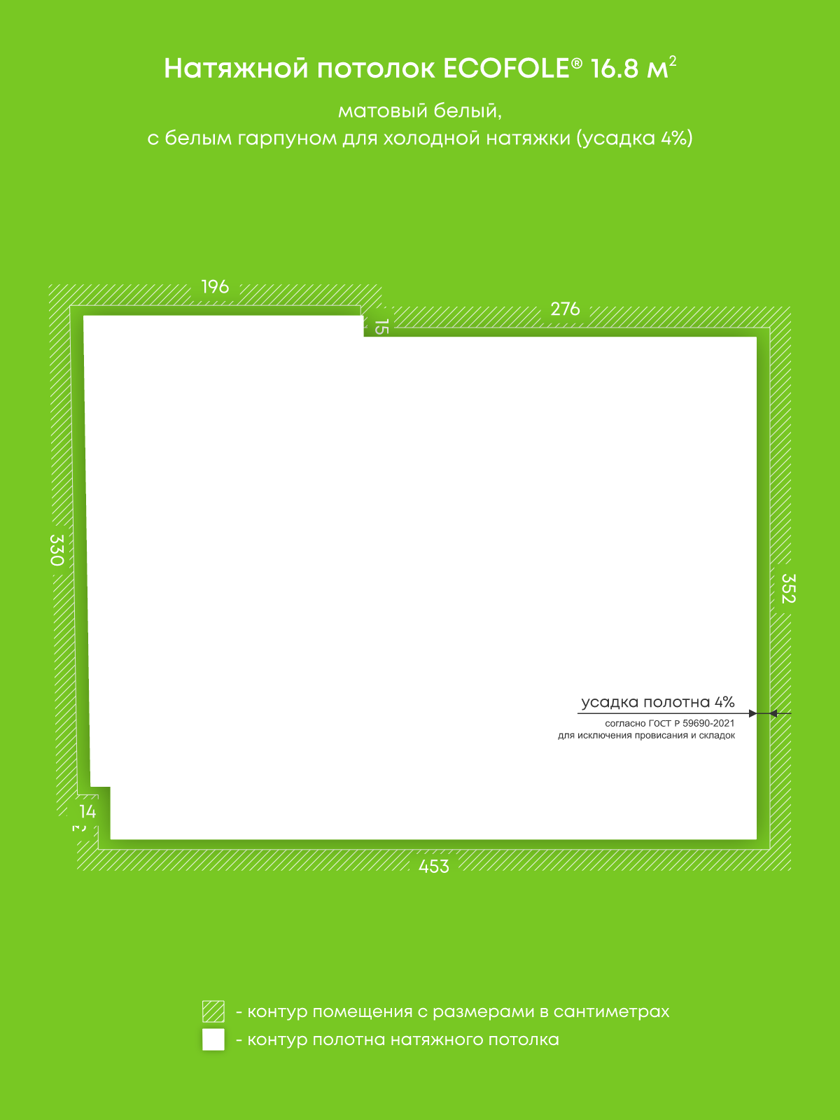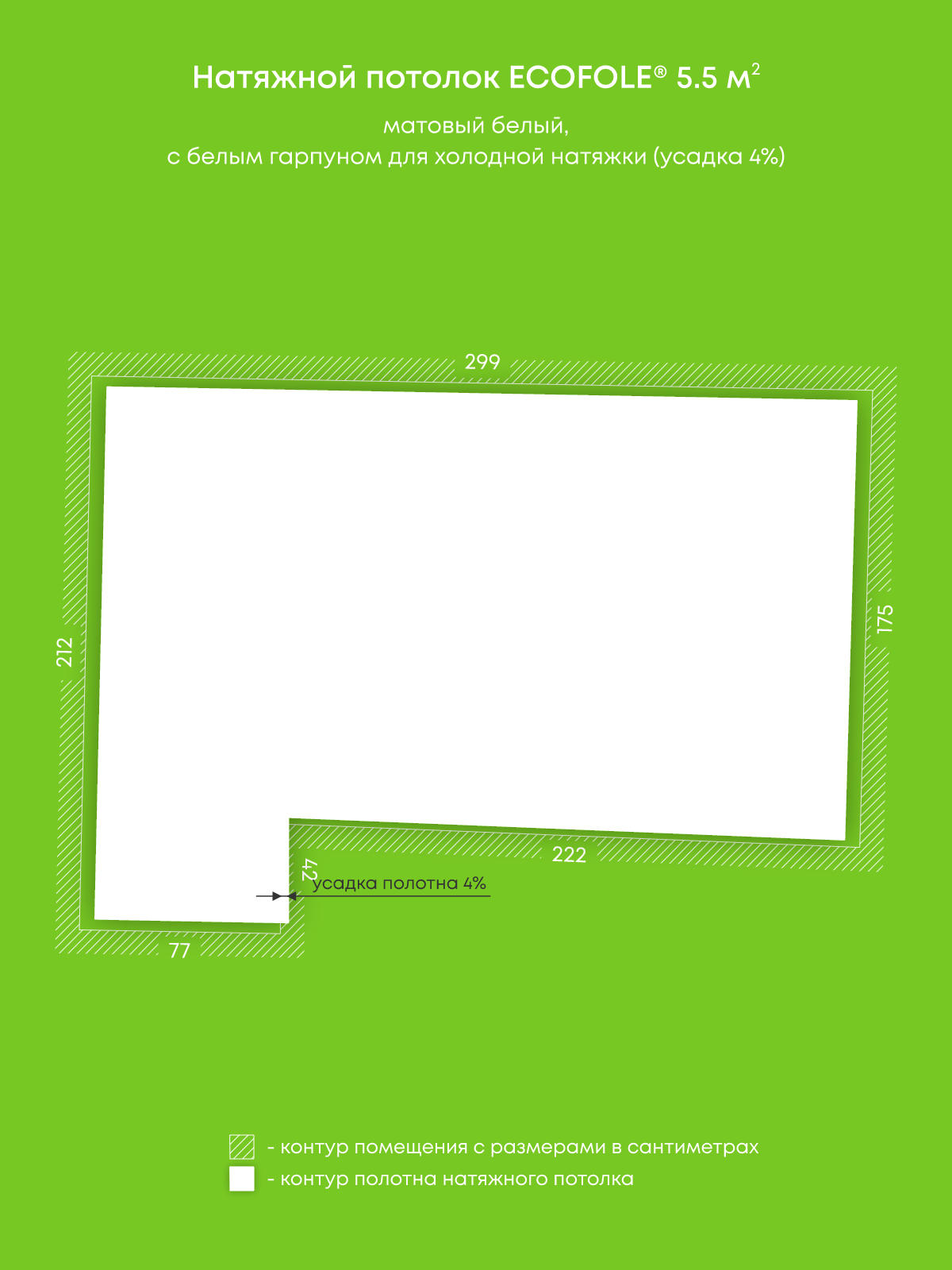 Натяжные потолки, изготовленные по индивидуальным размерам покупателя, для двух помещений площадью 5.5 м2, 16.8 м2