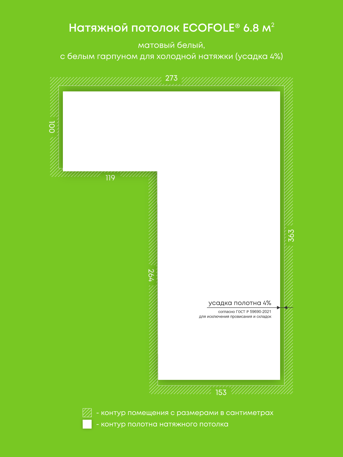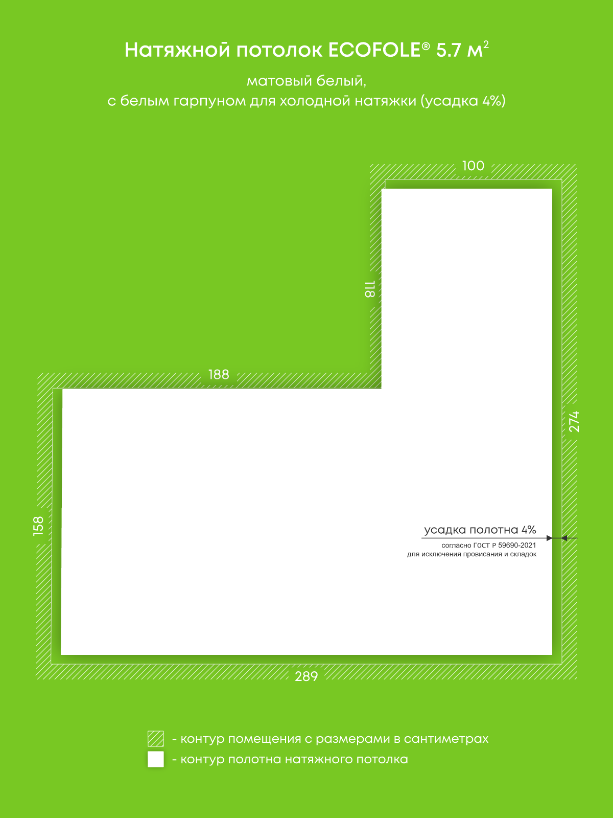 Натяжные потолки, изготовленные по индивидуальным размерам покупателя, для четырех помещений площадью 5.7 м2, 2.2 м2, 3.5 м2, 6.8 м2