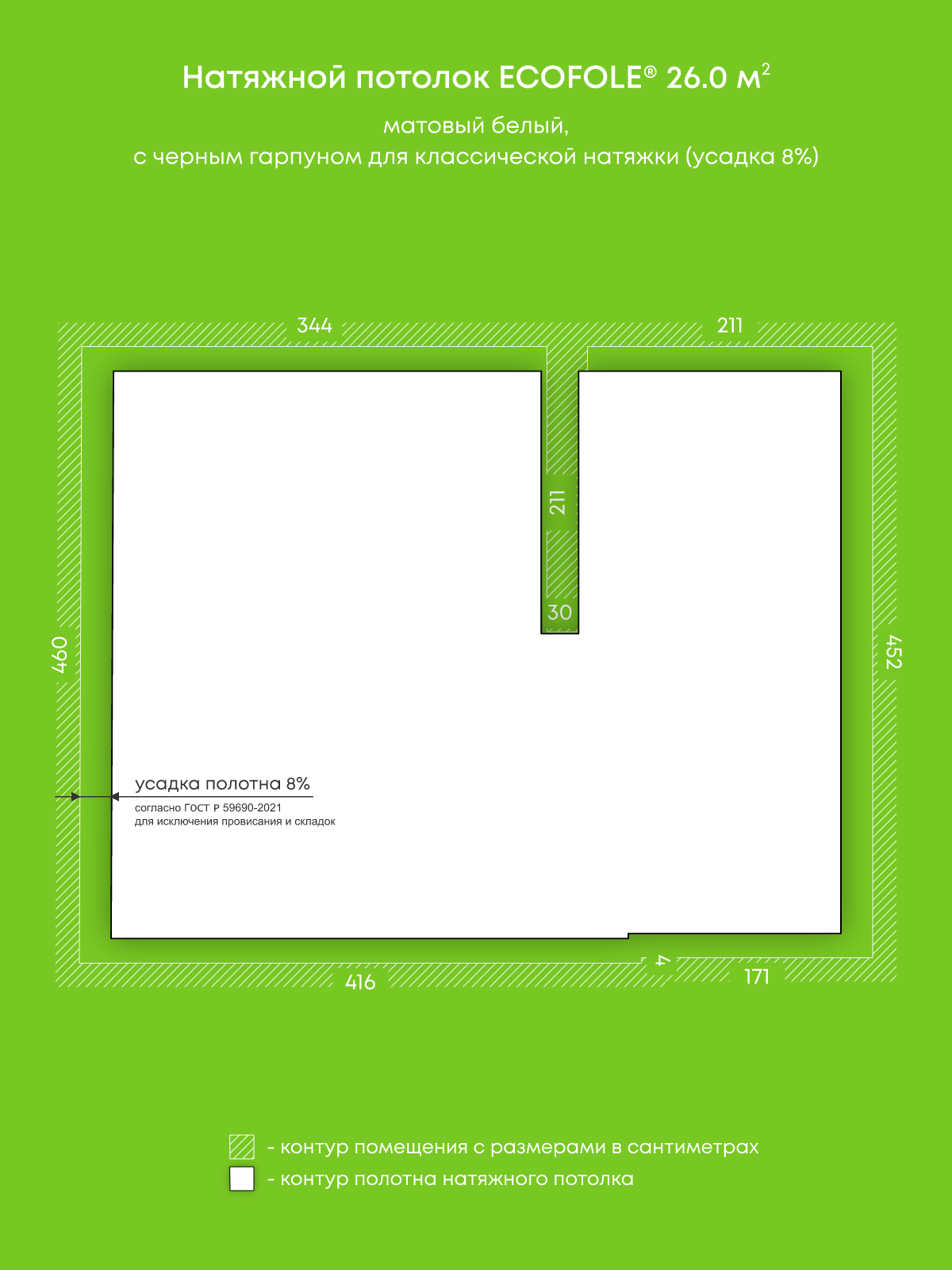Натяжные потолки, изготовленные по индивидуальным размерам покупателя, для четырех помещений площадью 5.9 м2, 13.3 м2, 22.7 м2, 26 м2