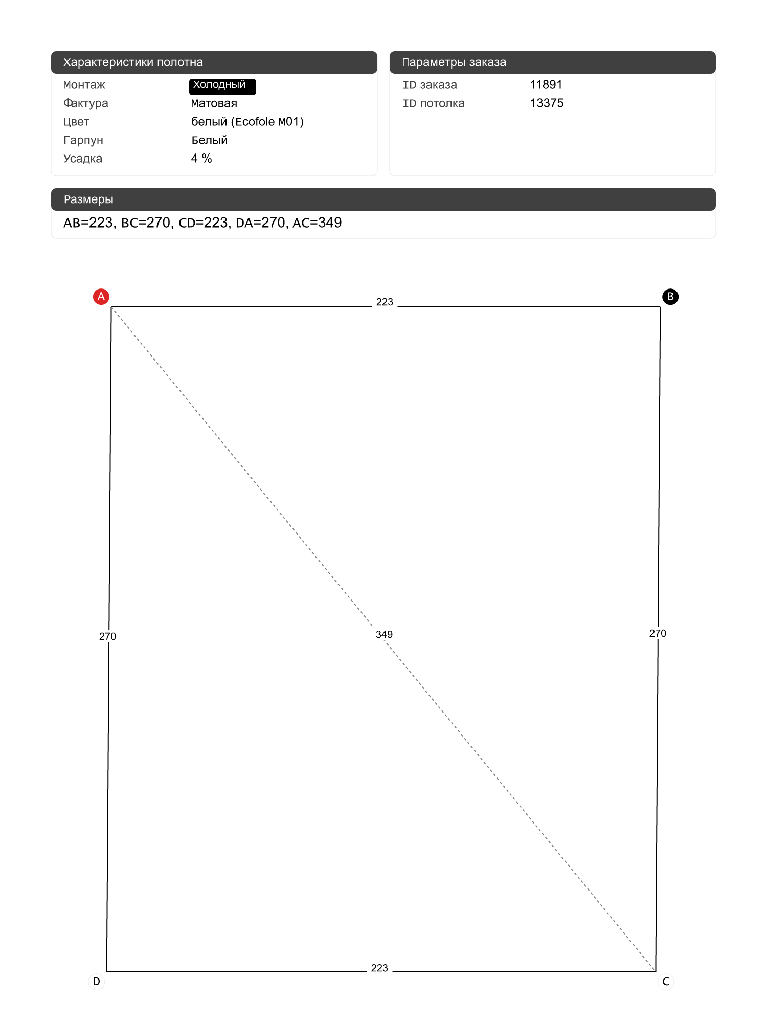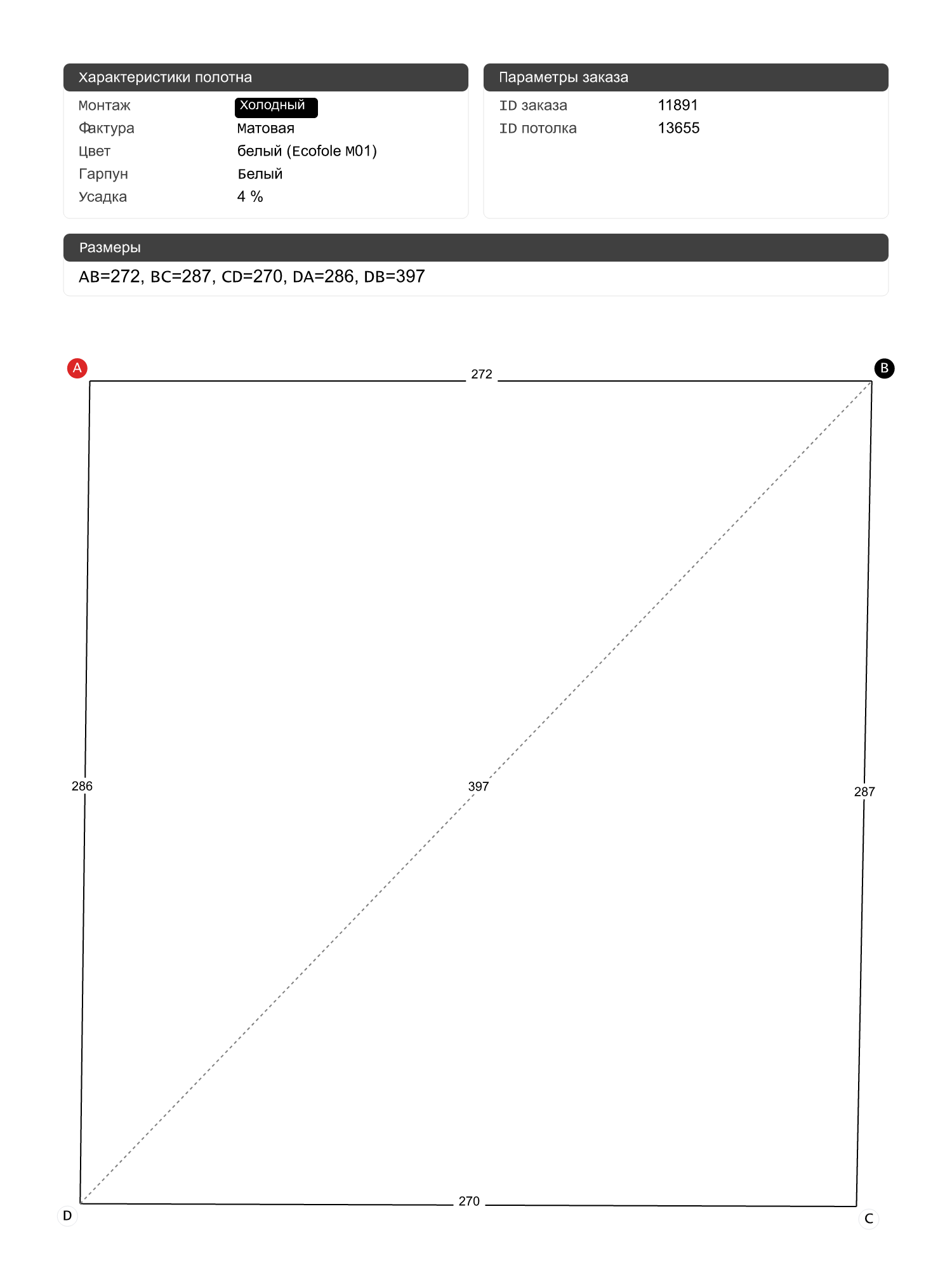 Натяжные потолки изготовленные по индивидуальным размерам покупателя, для двух помещений площадью: 6 м2, 7.8 м2