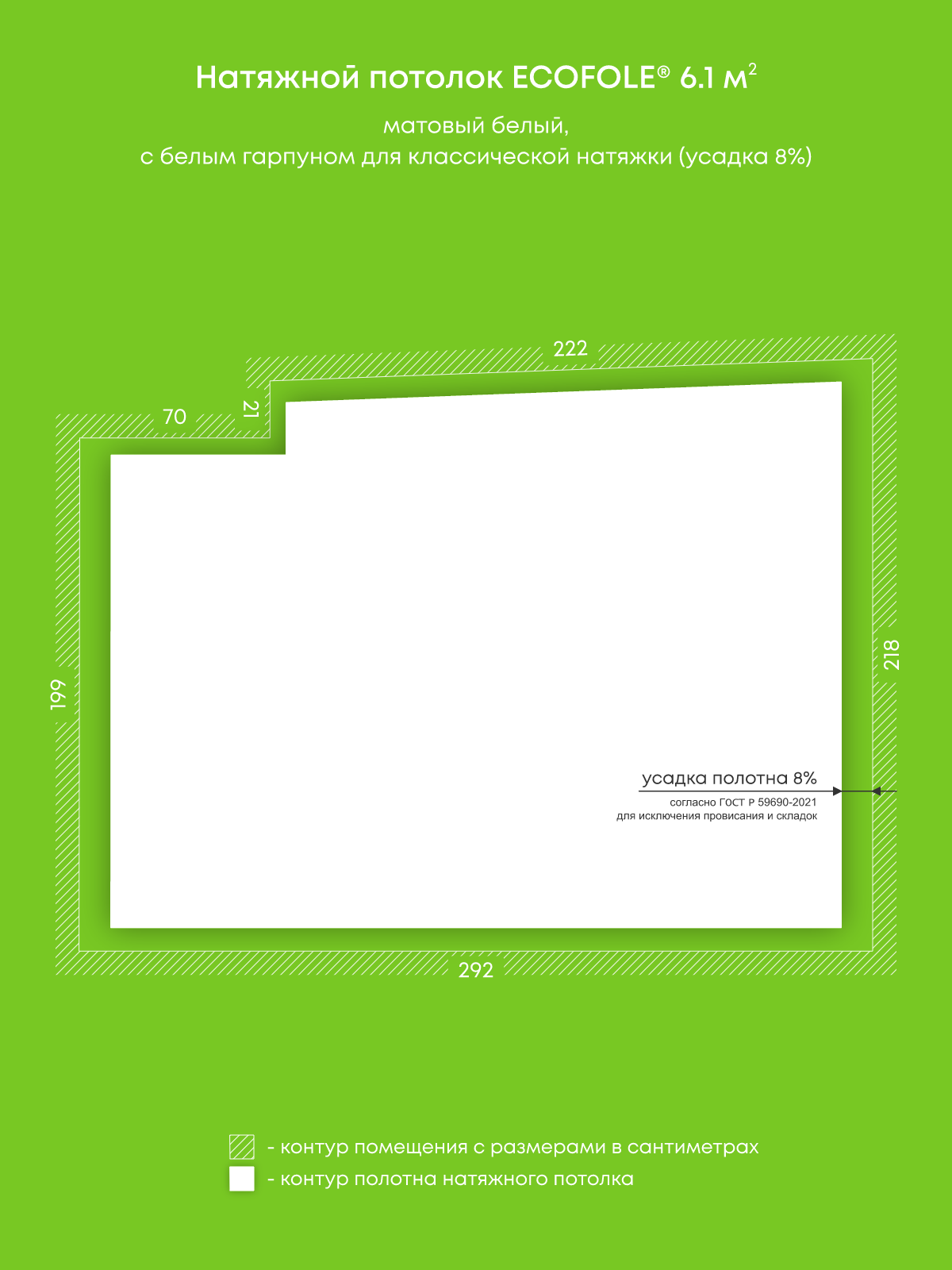Натяжные потолки, изготовленные по индивидуальным размерам покупателя, для двух помещений площадью 6.1 м2, 26.5 м2