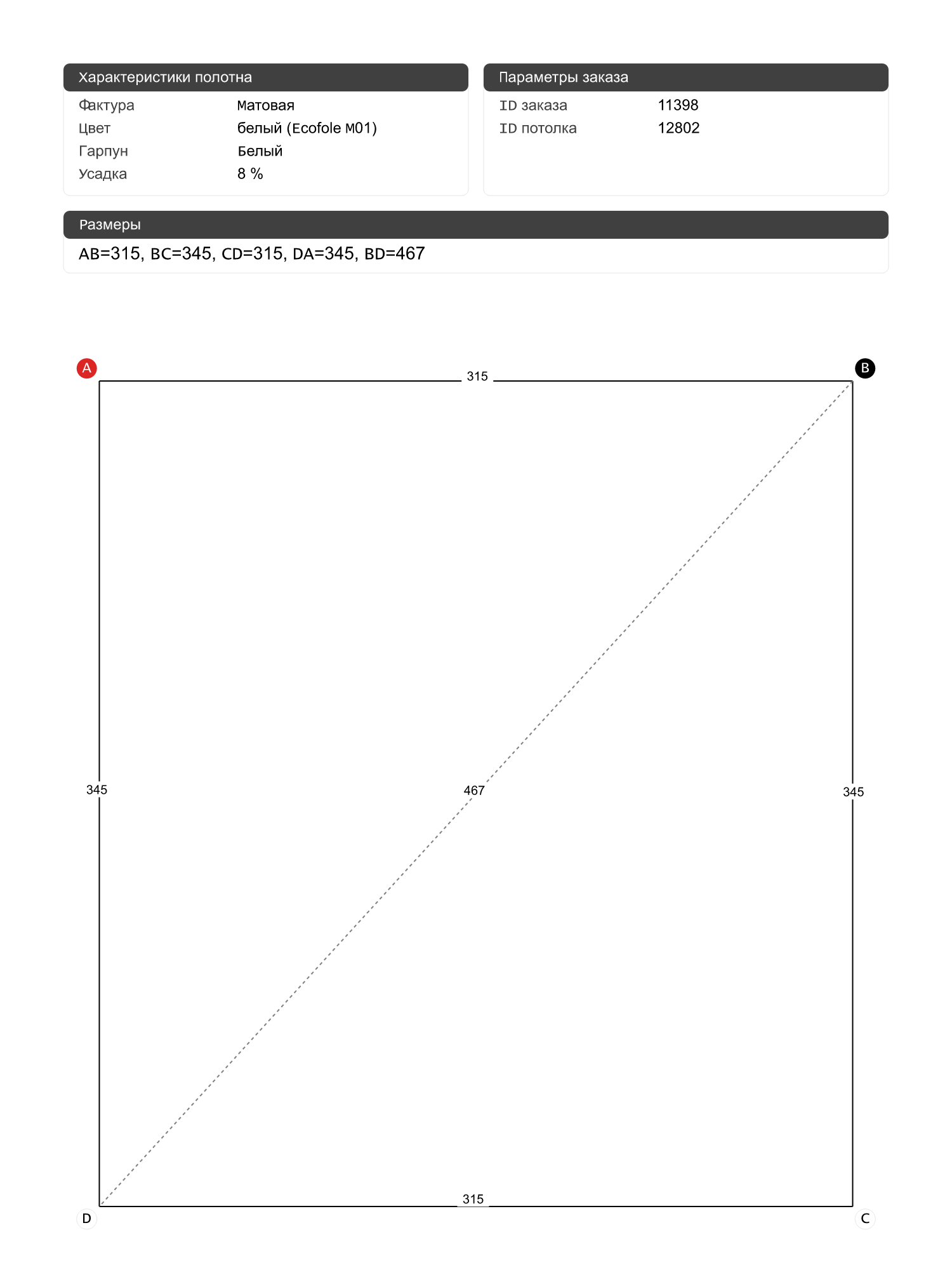 Натяжные потолки изготовленные по индивидуальным размерам покупателя, для двух помещений площадью: 6.5 м2, 10.9 м2