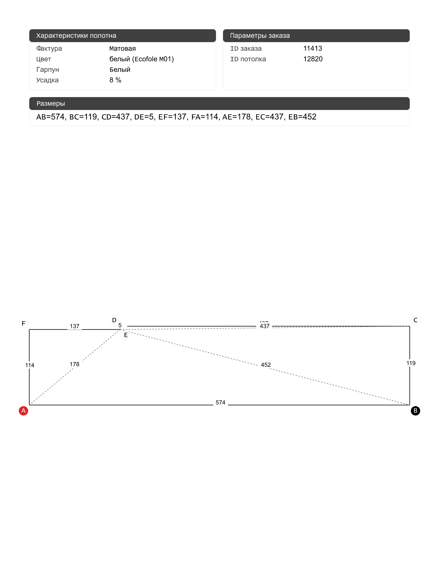 Натяжные потолки изготовленные по индивидуальным размерам покупателя, для двух помещений площадью: 6.8 м2, 6 м2