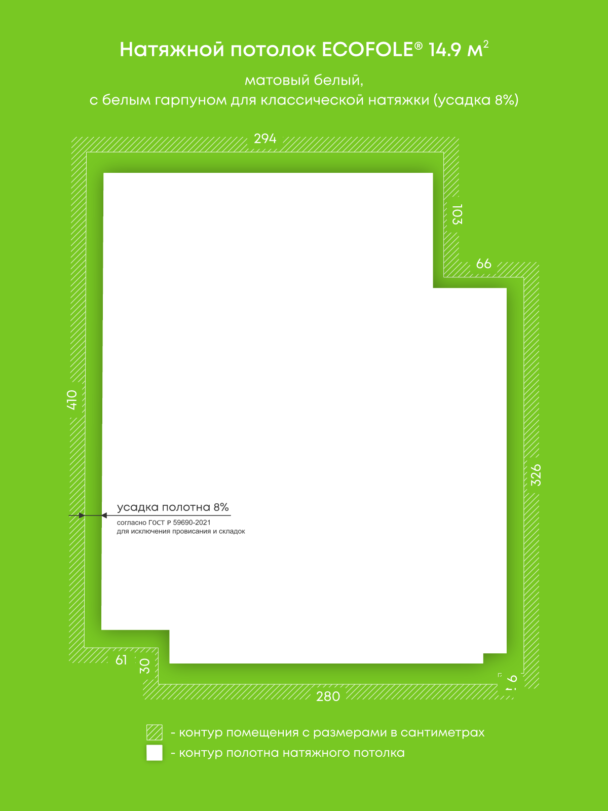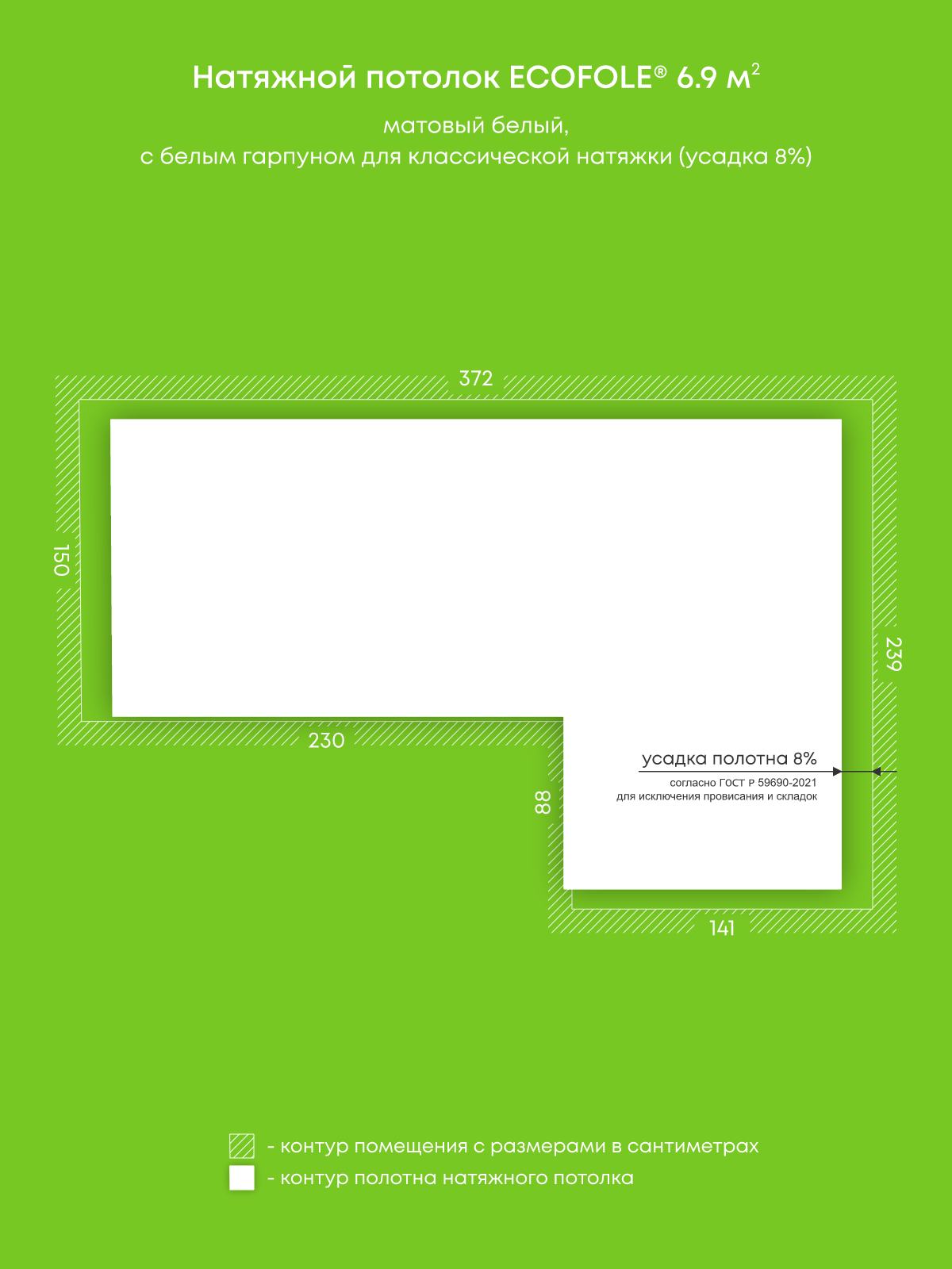 Натяжные потолки, изготовленные по индивидуальным размерам покупателя, для двух помещений площадью 6.9 м2, 14.9 м2
