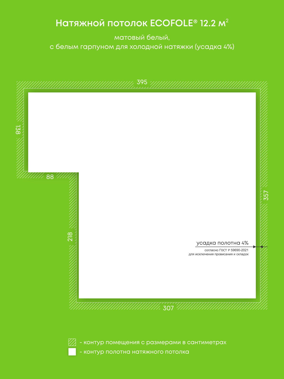 Натяжные потолки, изготовленные по индивидуальным размерам покупателя, для двух помещений площадью 7.7 м2, 12.2 м2