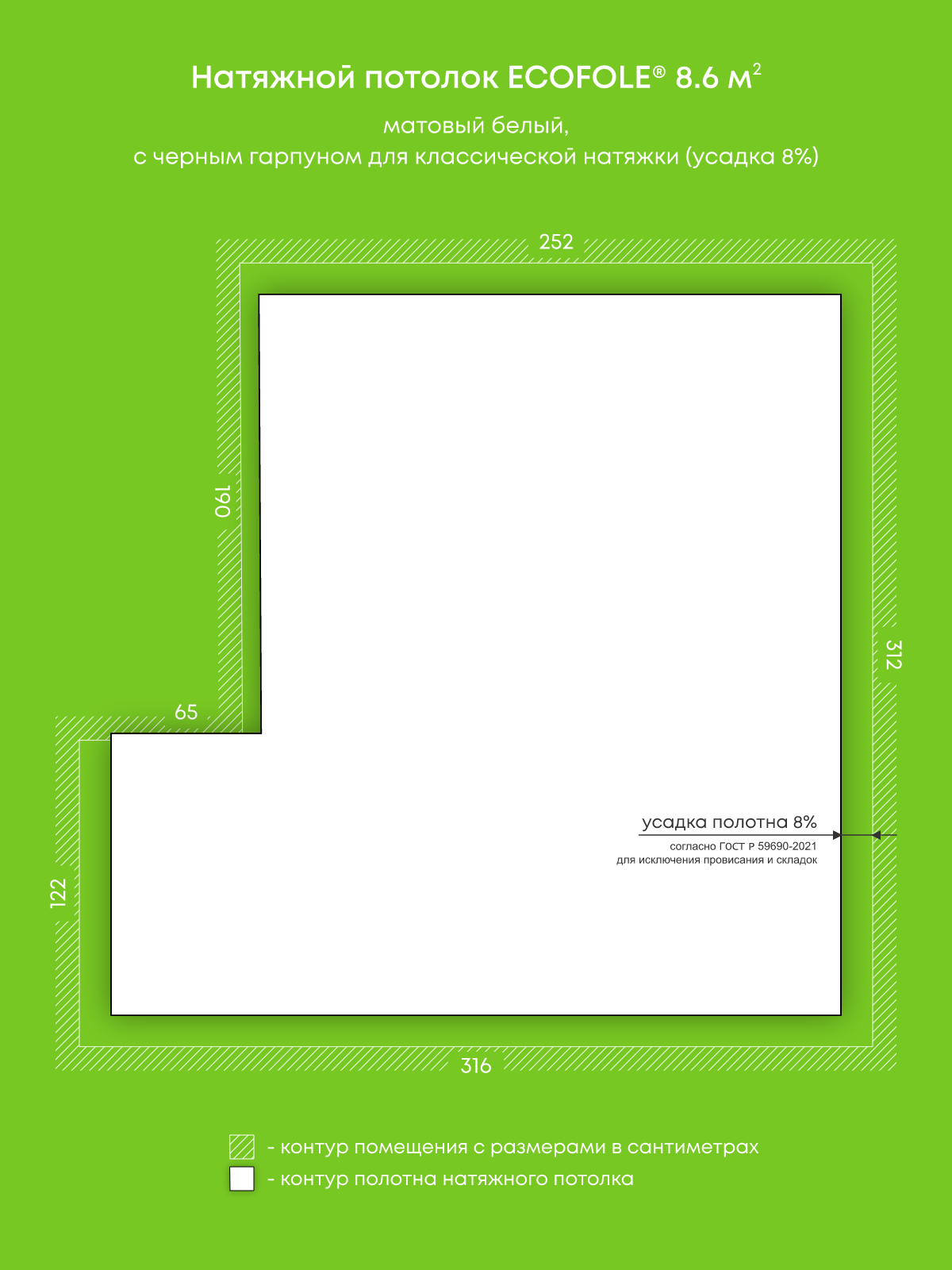 Натяжные потолки, изготовленные по индивидуальным размерам покупателя, для двух помещений площадью 8.6 м2, 20.1 м2