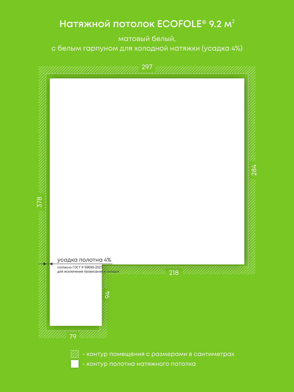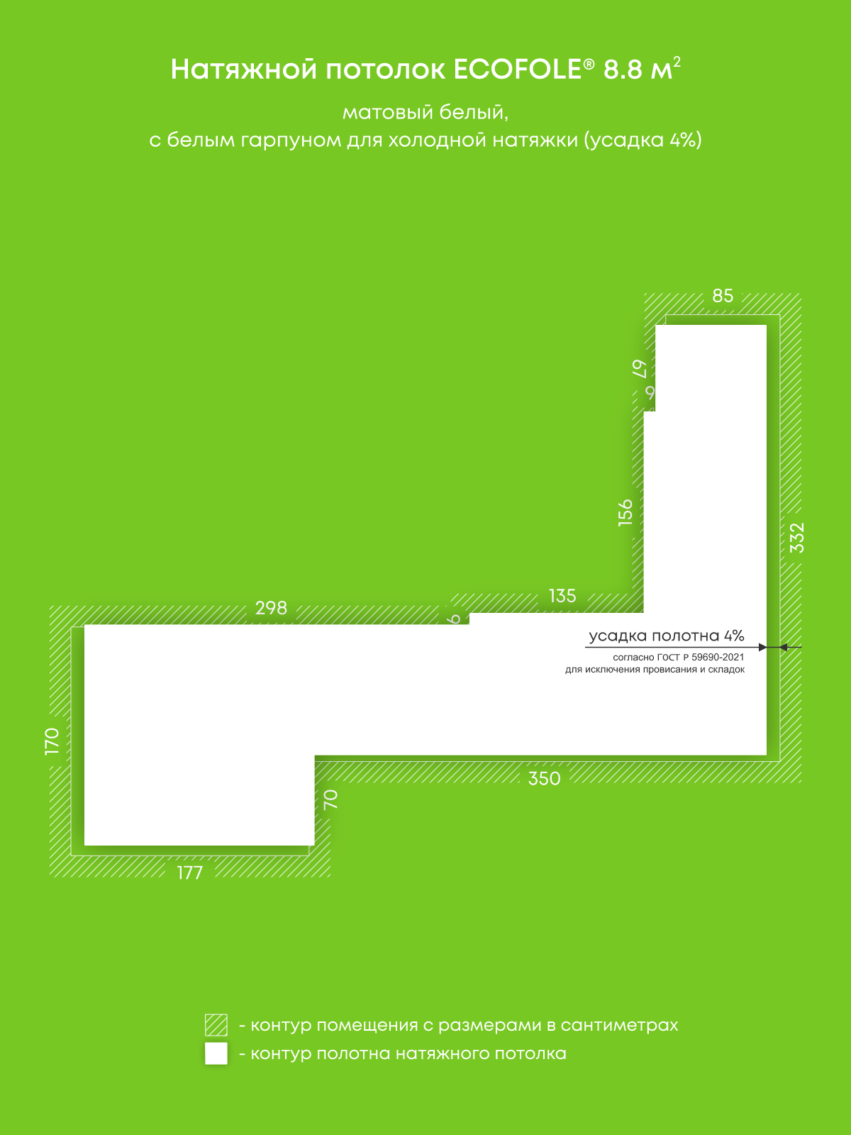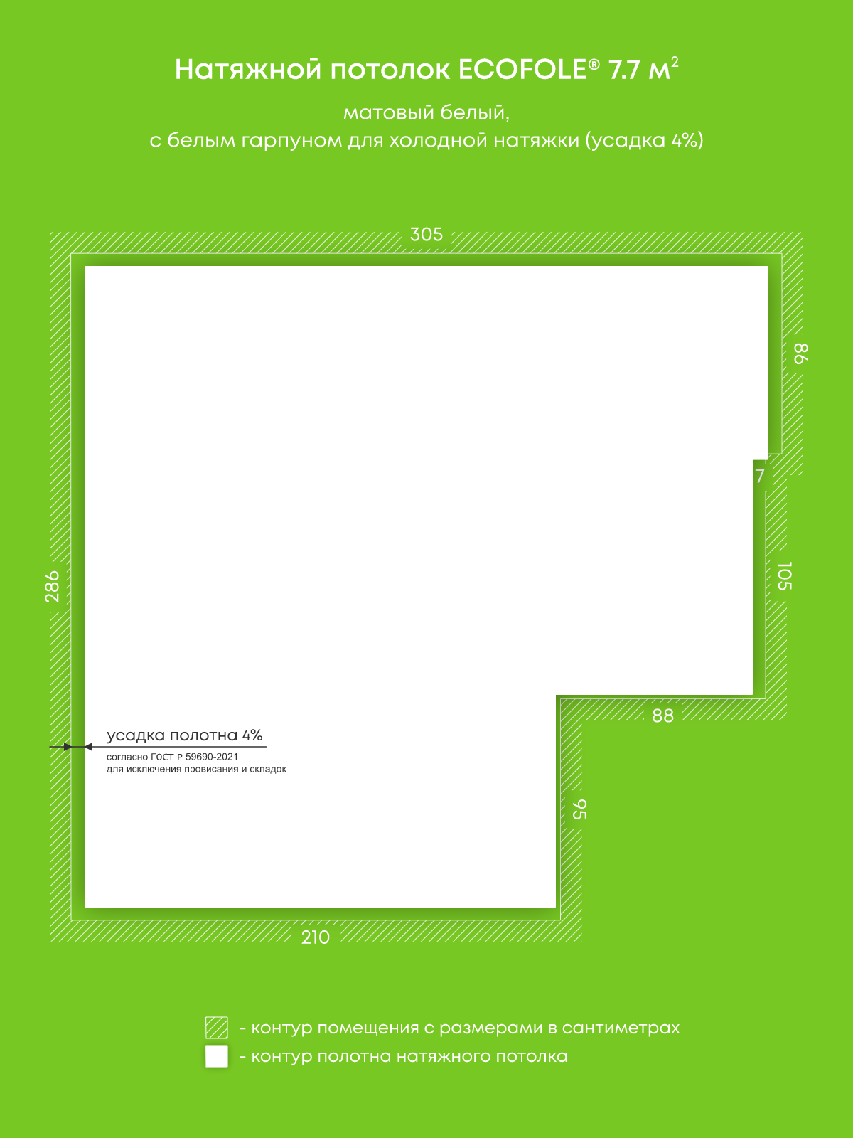 Натяжные потолки, изготовленные по индивидуальным размерам покупателя, для пяти помещений площадью 8.8 м2, 7.7 м2, 9.2 м2, 8.4 м2, 4.2 м2