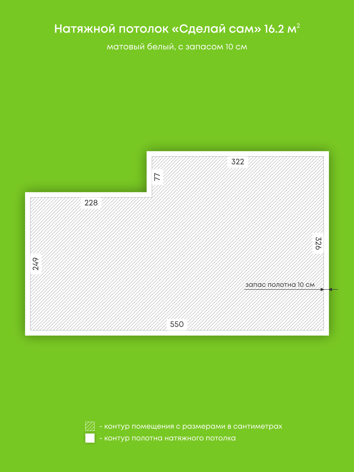 Натяжные потолки, изготовленные по индивидуальным размерам покупателя, для пяти помещений площадью 8.9 м2, 3.4 м2, 4.1 м2, 16.2 м2, 6.6 м2