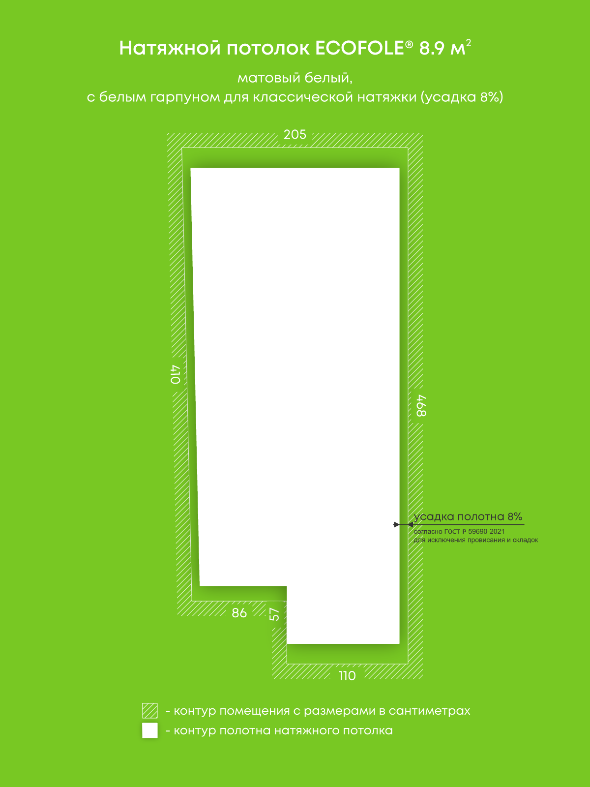 Натяжные потолки, изготовленные по индивидуальным размерам покупателя, для четырех помещений площадью 9.2 м2, 11.8 м2, 15.2 м2, 8.9 м2