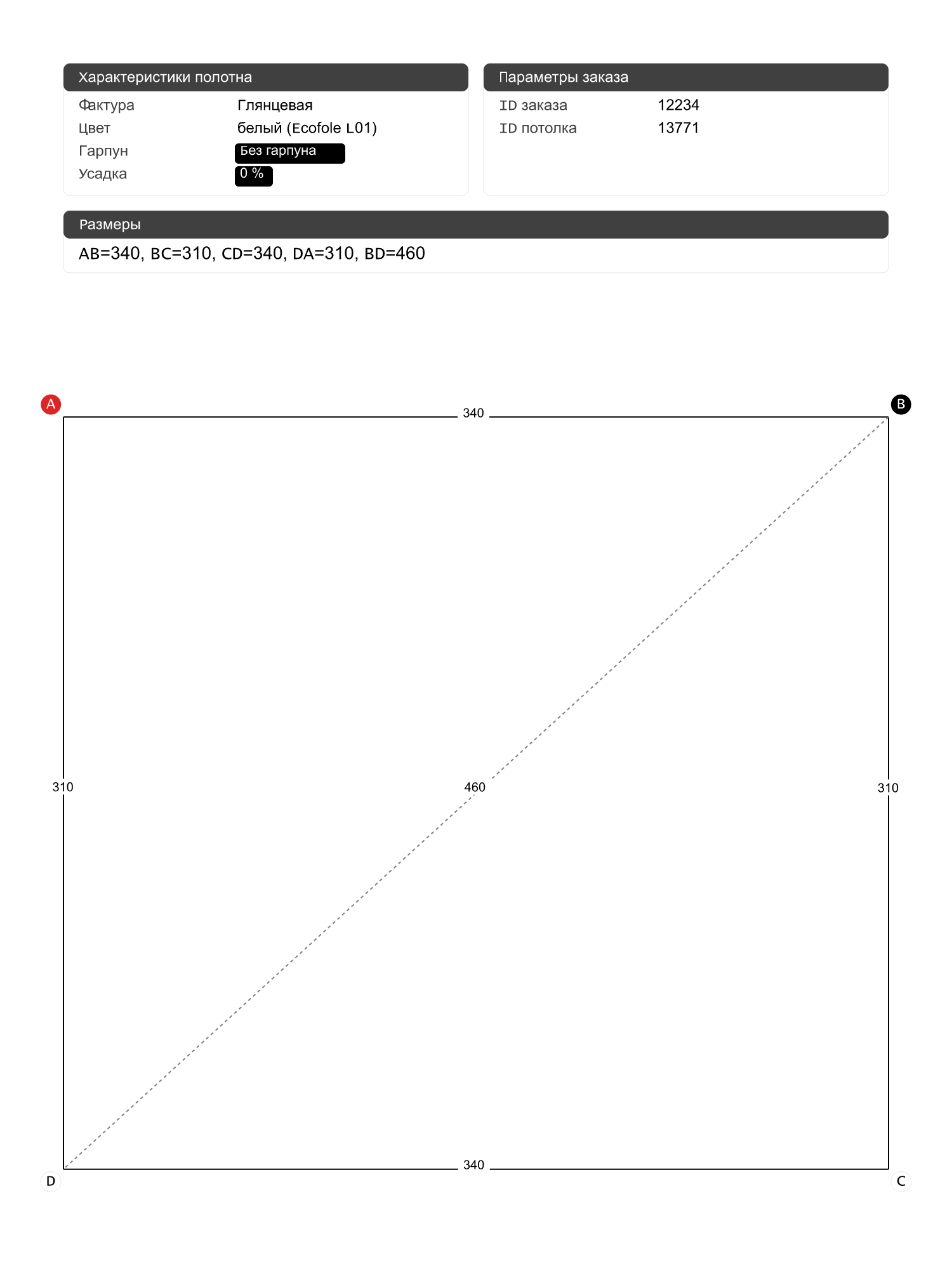 Натяжные потолки изготовленные по индивидуальным размерам покупателя, для двух помещений площадью: 9.3 м2, 3.8 м2