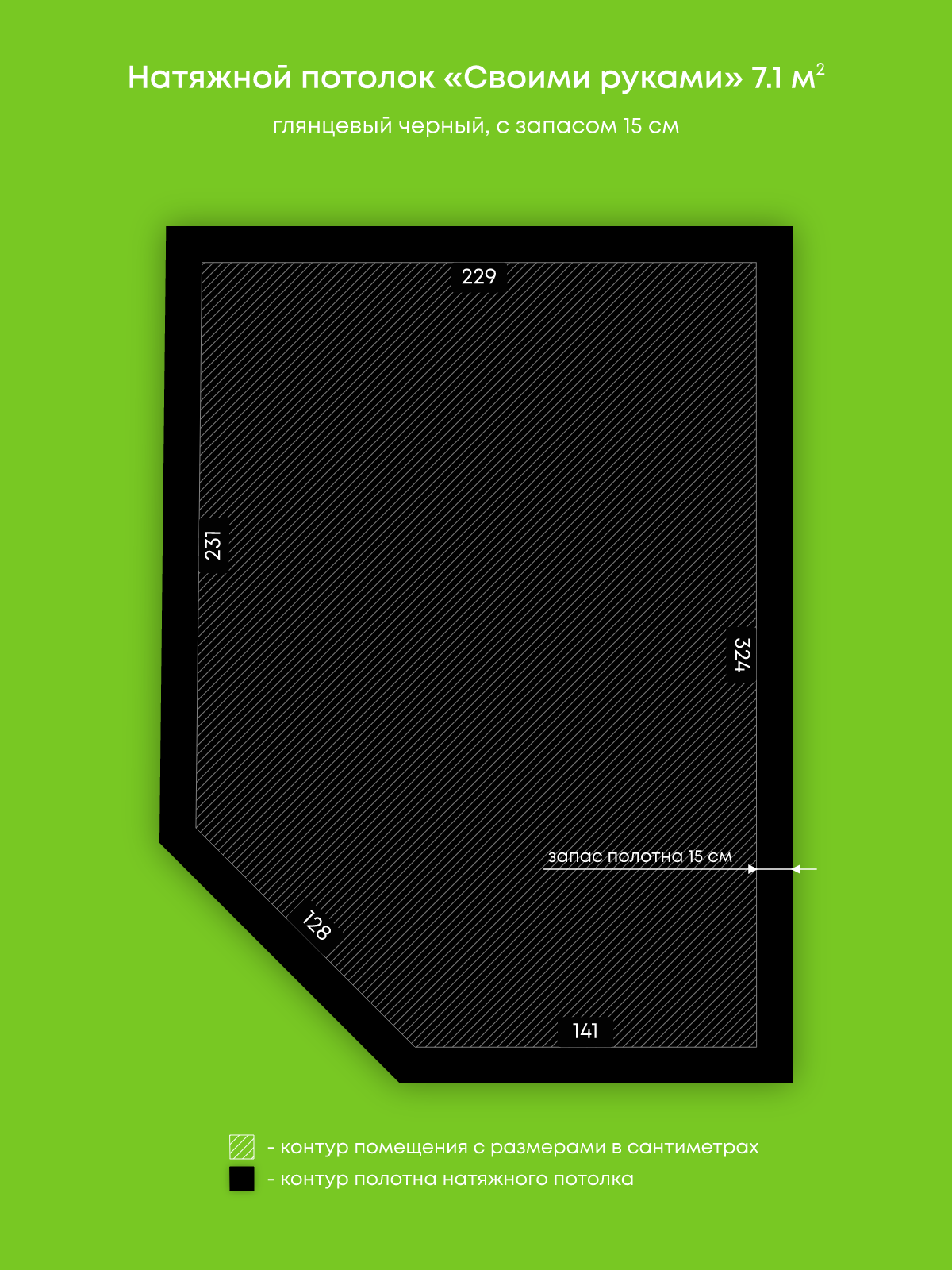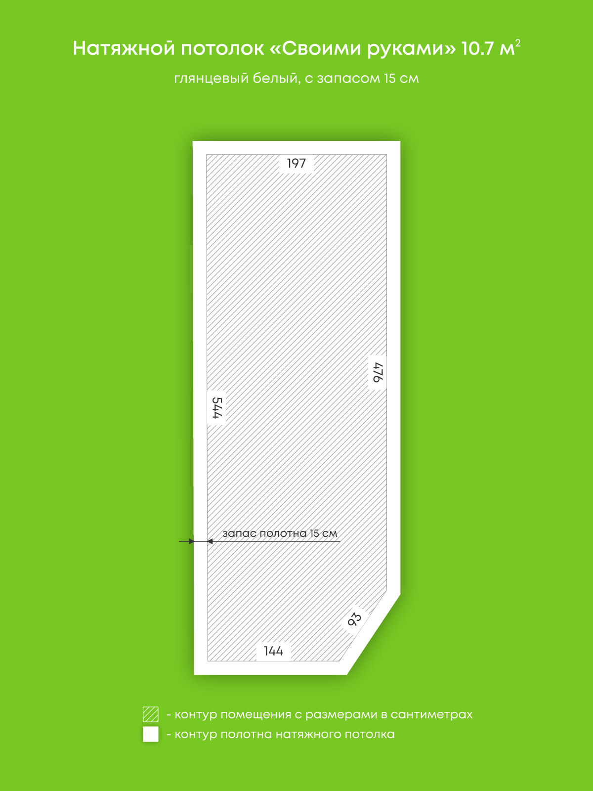 Натяжные потолки, изготовленные по индивидуальным размерам покупателя, для трех помещений площадью 9.4 м2, 10.7 м2, 7.1 м2