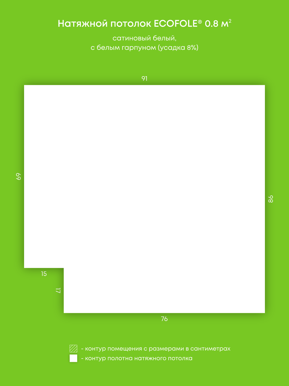 Натяжной потолок белый сатиновый, изготовленный по индивидуальным размерам покупателя, для помещения площадью 0.8 м2
