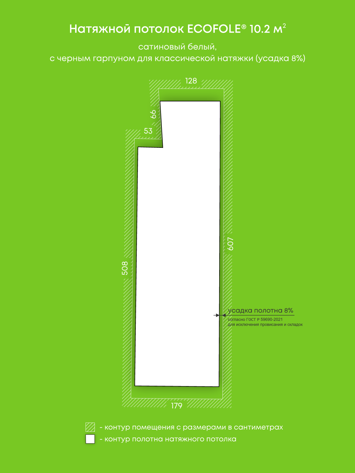 Натяжной потолок белый сатиновый, изготовленный по индивидуальным размерам покупателя, для помещения площадью 10.2 м2