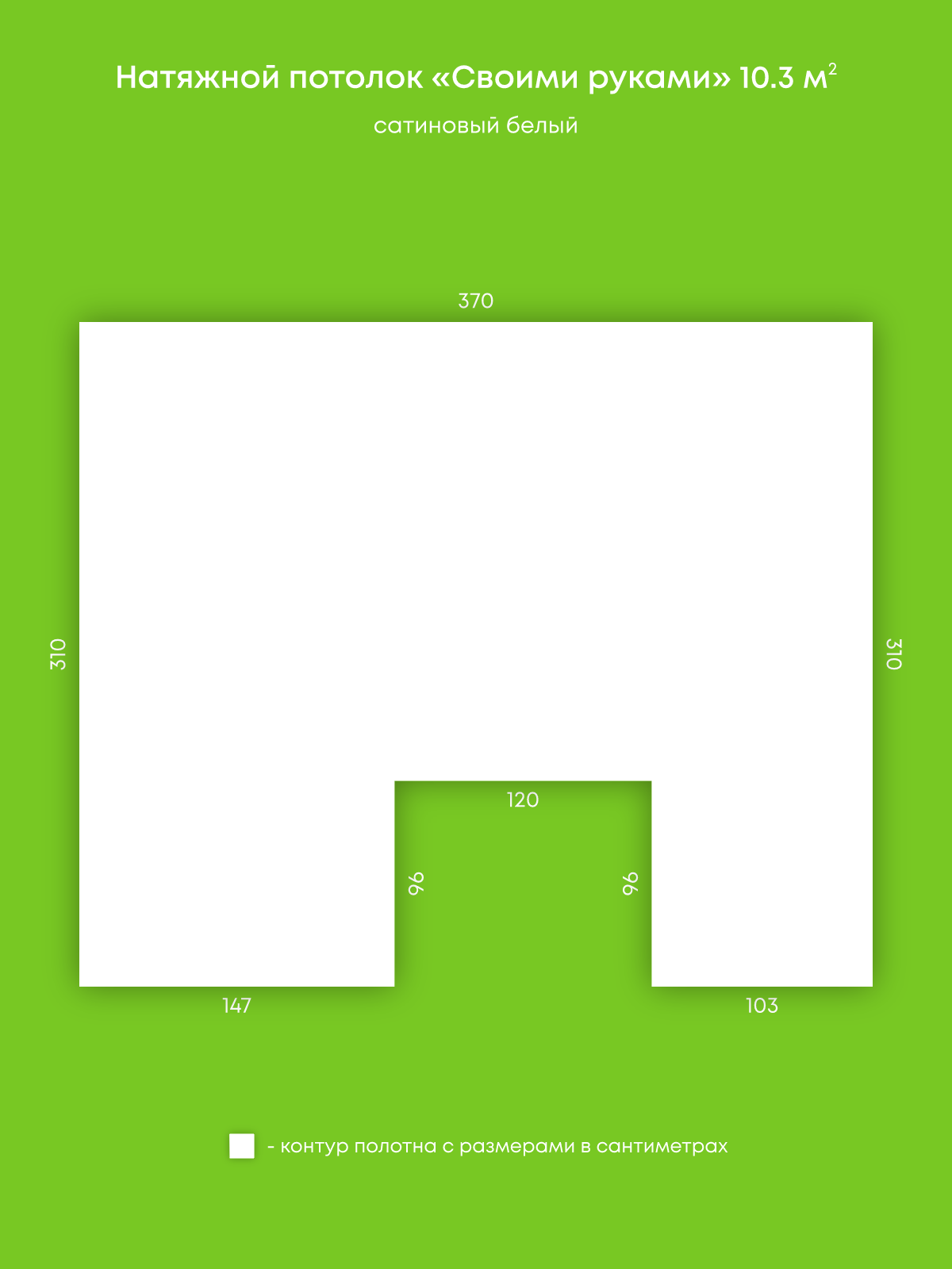Натяжной потолок белый сатиновый, изготовленный по индивидуальным размерам покупателя, для помещения площадью 10.3 м2