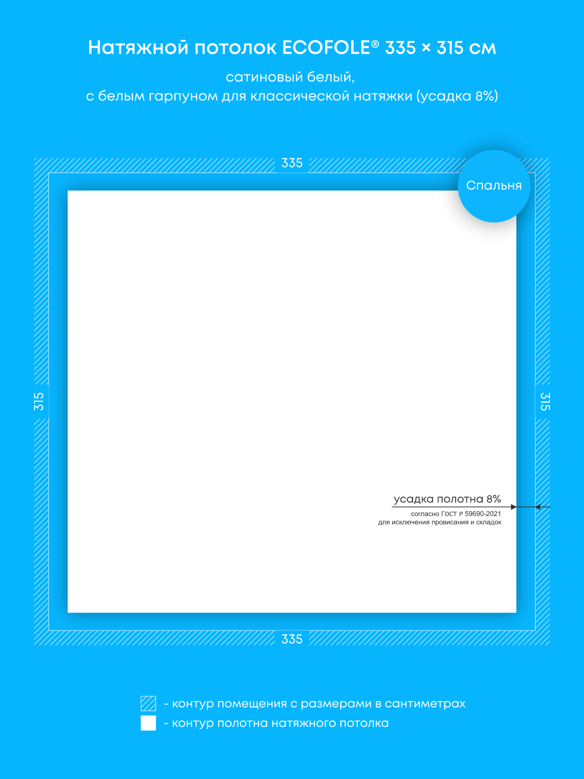 Натяжной потолок белый сатиновый, классической натяжки, изготовленный по индивидуальным размерам покупателя, для помещения площадью 10.6 м2