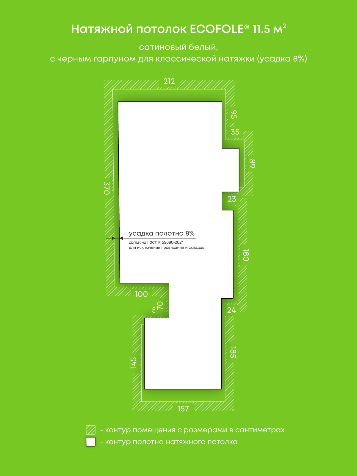 Натяжной потолок белый сатиновый, изготовленный по индивидуальным размерам покупателя, для гостиной площадью 11.5 м2