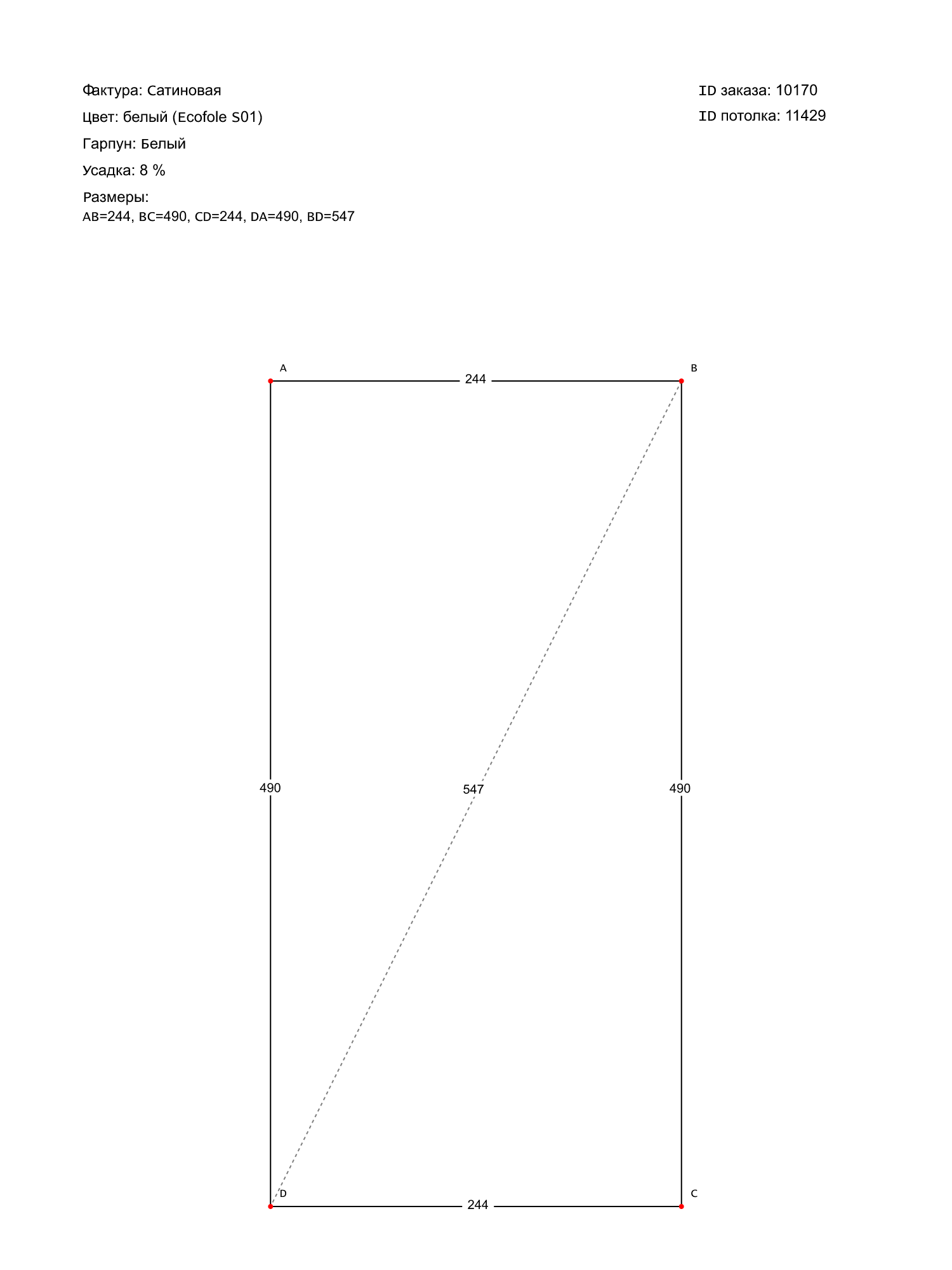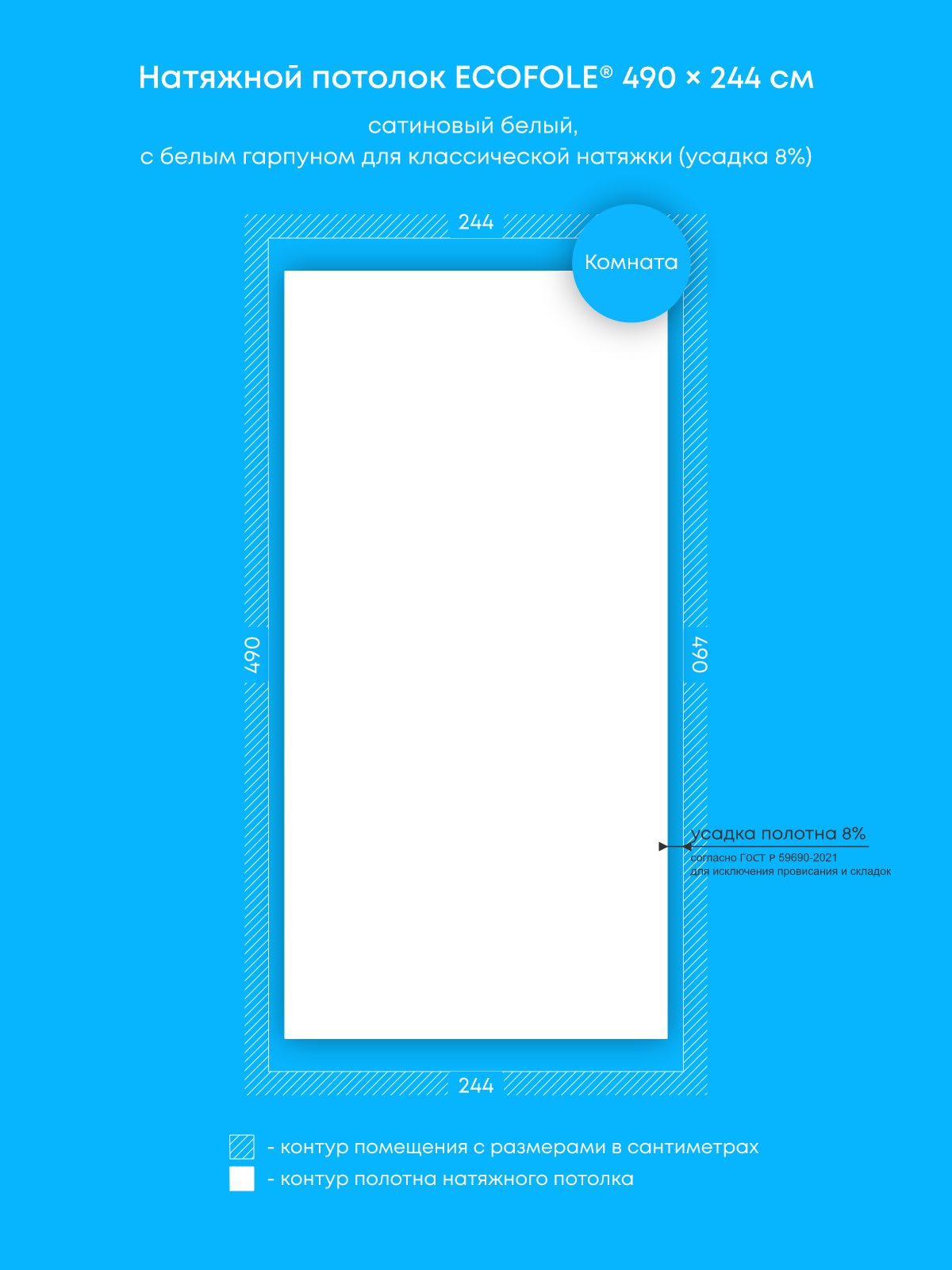 Натяжной потолок белый сатиновый, классической натяжки, изготовленный по индивидуальным размерам покупателя, для помещения площадью 12 м2