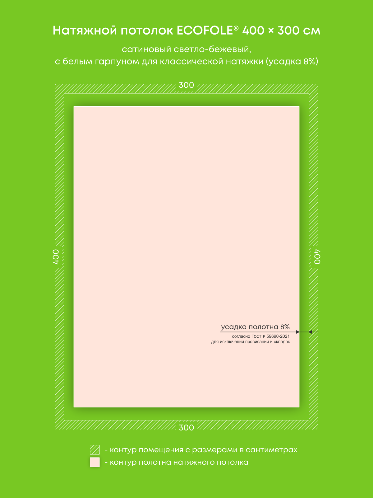 Натяжной потолок светло-бежевый сатиновый, изготовленный по индивидуальным размерам покупателя, для гостиной площадью 12 м2