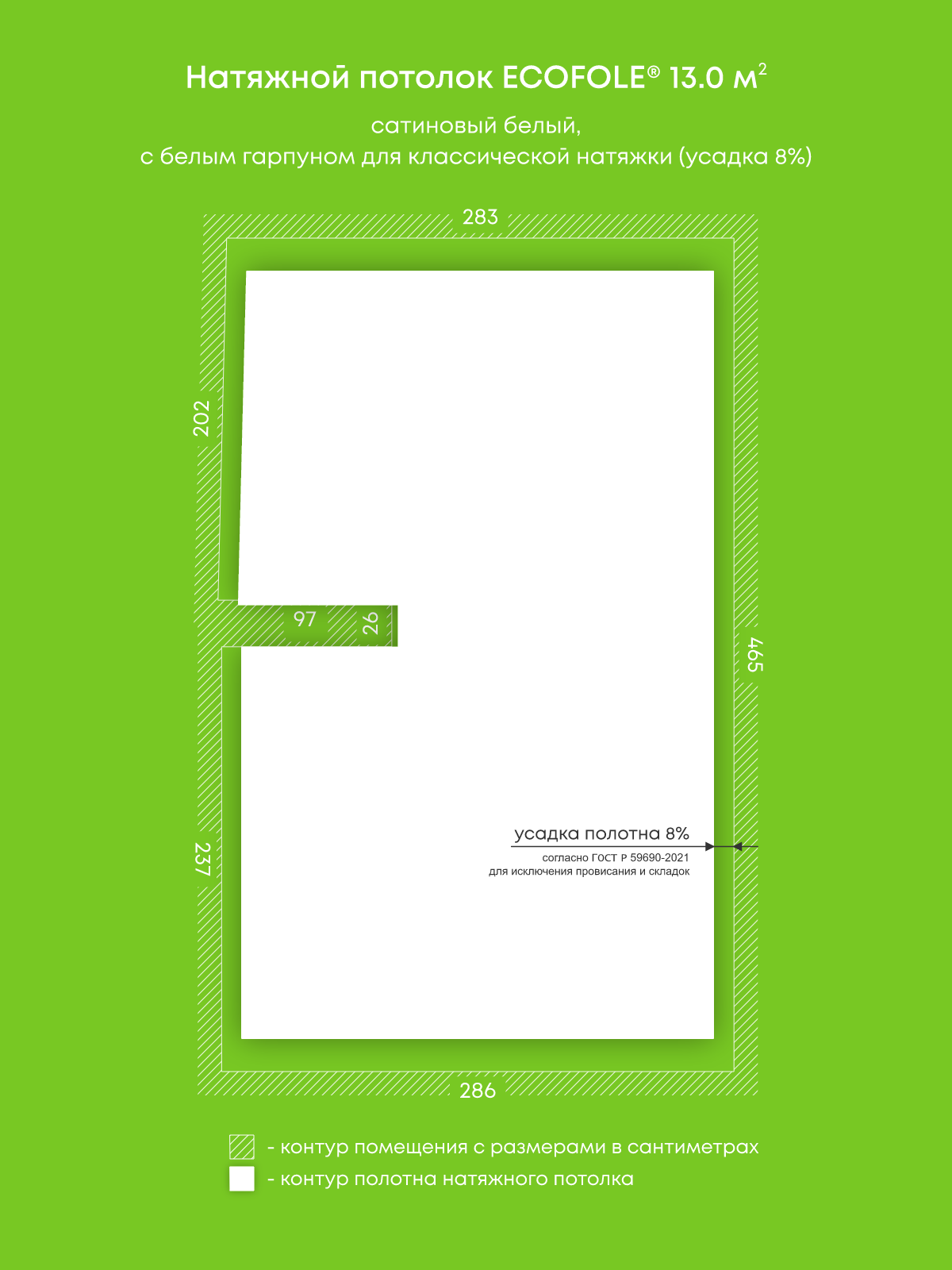 Натяжной потолок белый сатиновый, изготовленный по индивидуальным размерам покупателя, для гостиной площадью 13 м2