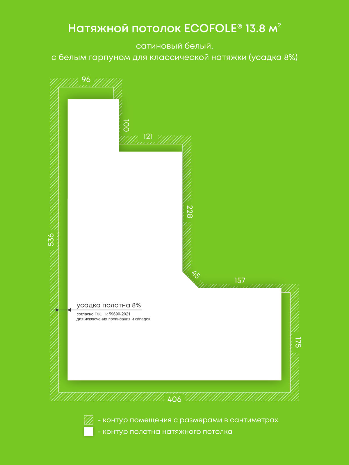 Натяжной потолок белый сатиновый, изготовленный по индивидуальным размерам покупателя, для помещения площадью 13.8 м2