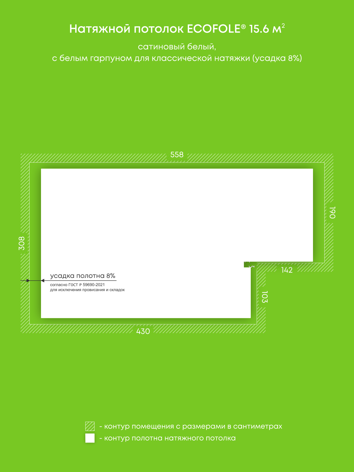 Натяжной потолок белый сатиновый, изготовленный по индивидуальным размерам покупателя, для гостиной площадью 15.6 м2