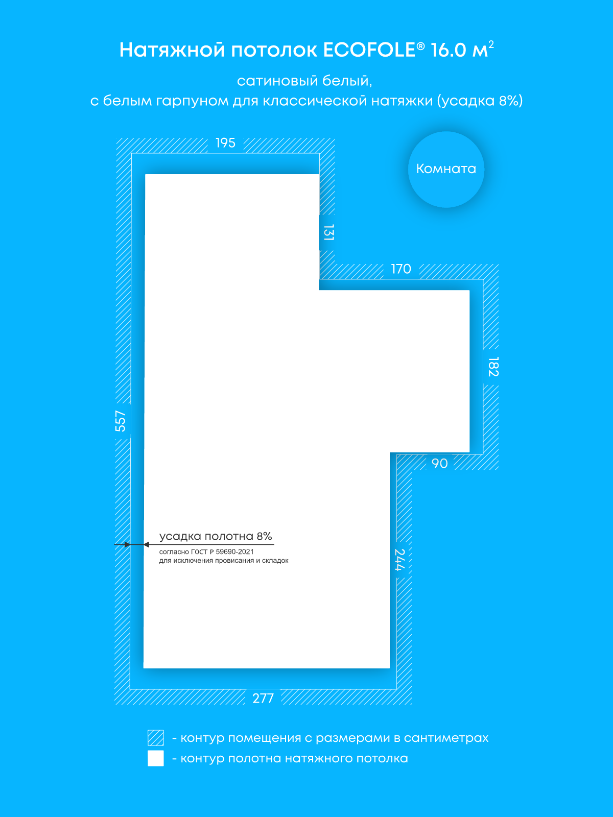 Натяжной потолок белый сатиновый, изготовленный по индивидуальным размерам покупателя, для комнаты площадью 16 м2